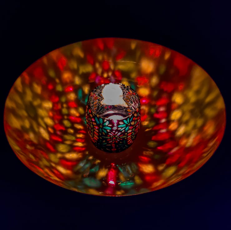 This candleholder depicts a Moroccan two symmetrical circular patterns shining through a black background. It's painted on a whiskey tumbler glass and covered with layer of transparent varnish for protection.