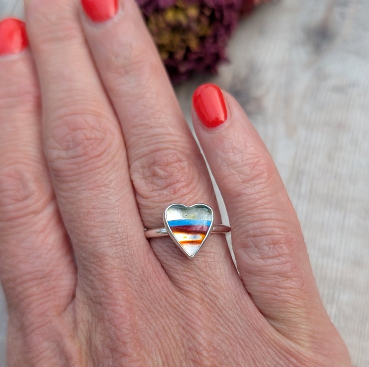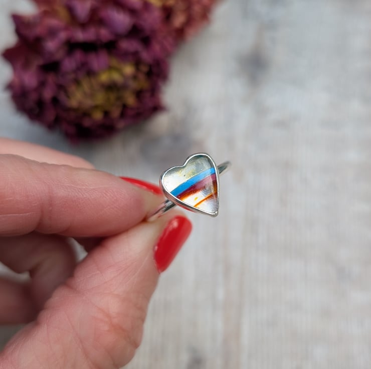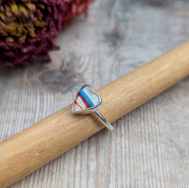 This handmade heart-shaped ring features a colourful Surfite stone, set in a bezel of recycled sterling silver. The stone displays vibrant horizontal stripes of red, orange, blue, and green – a one-off pattern formed from layers of surfboard resin, making this ring truly unique.