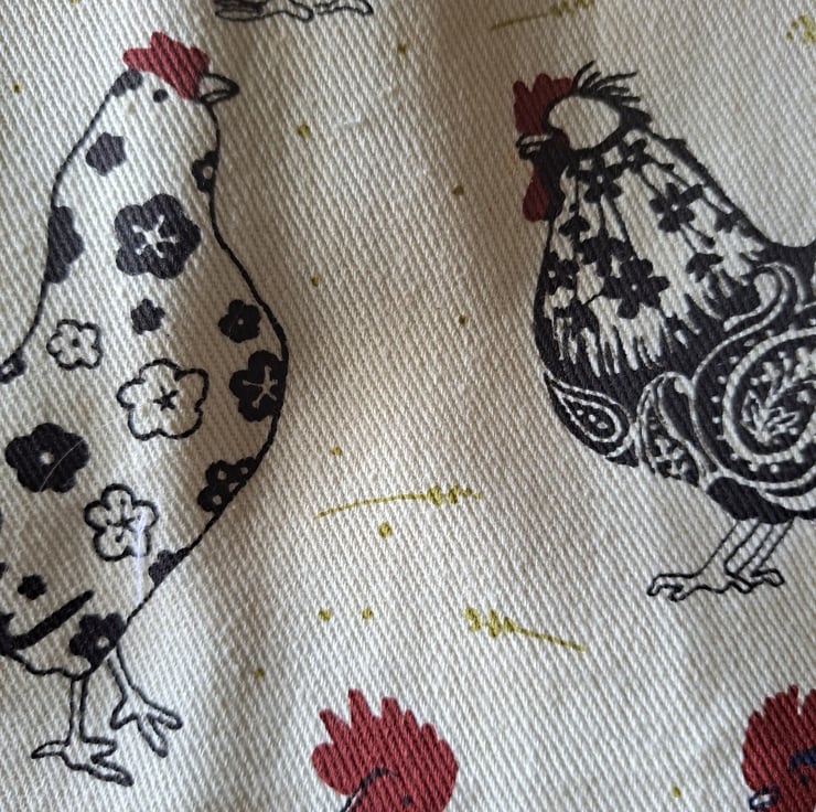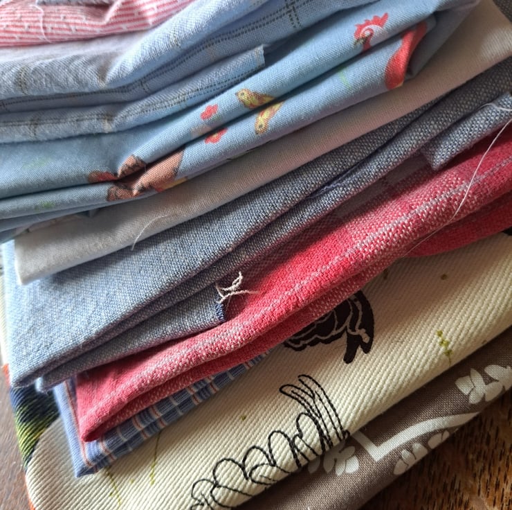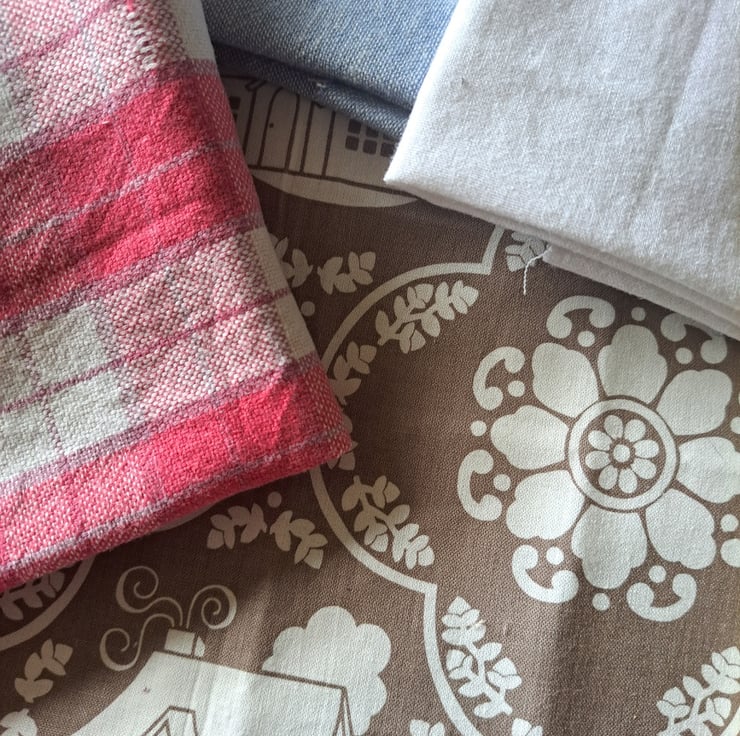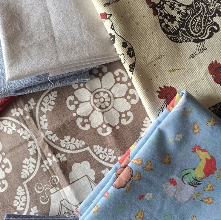 You can almost hear the gentle clucking coming from this nice big pile of smallholding-themed new, repurposed, rescued and vintage fabrics. There are 10 cotton or linen good-sized pieces in this bundle, many with country checks and stripes, two with hens and one with a lovely homespun image of a house against a brown background.