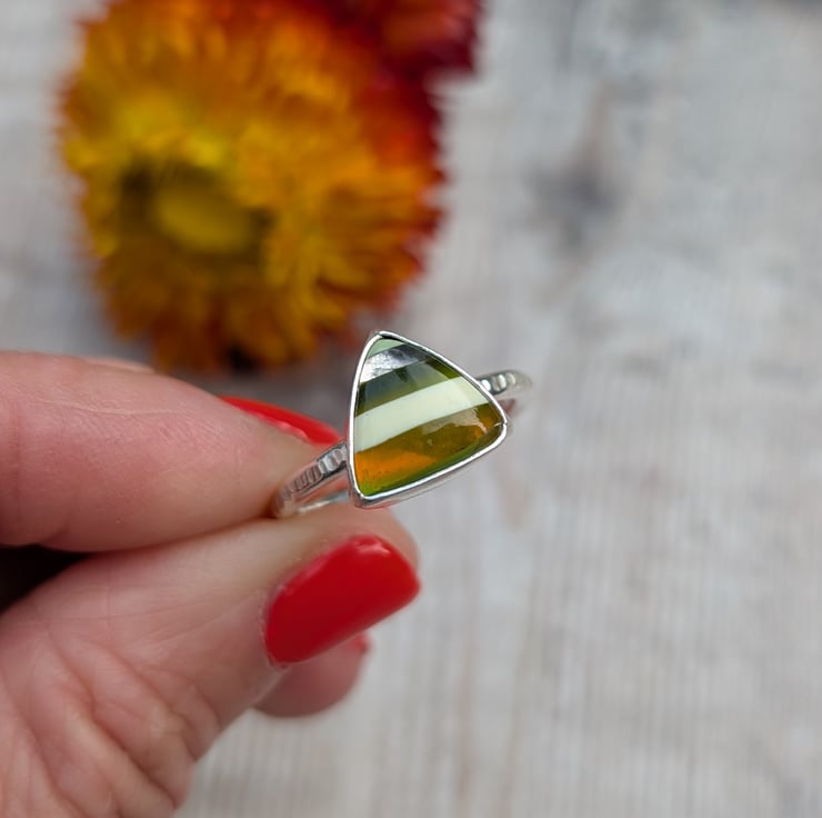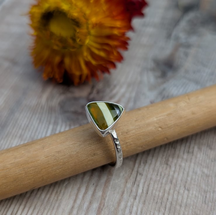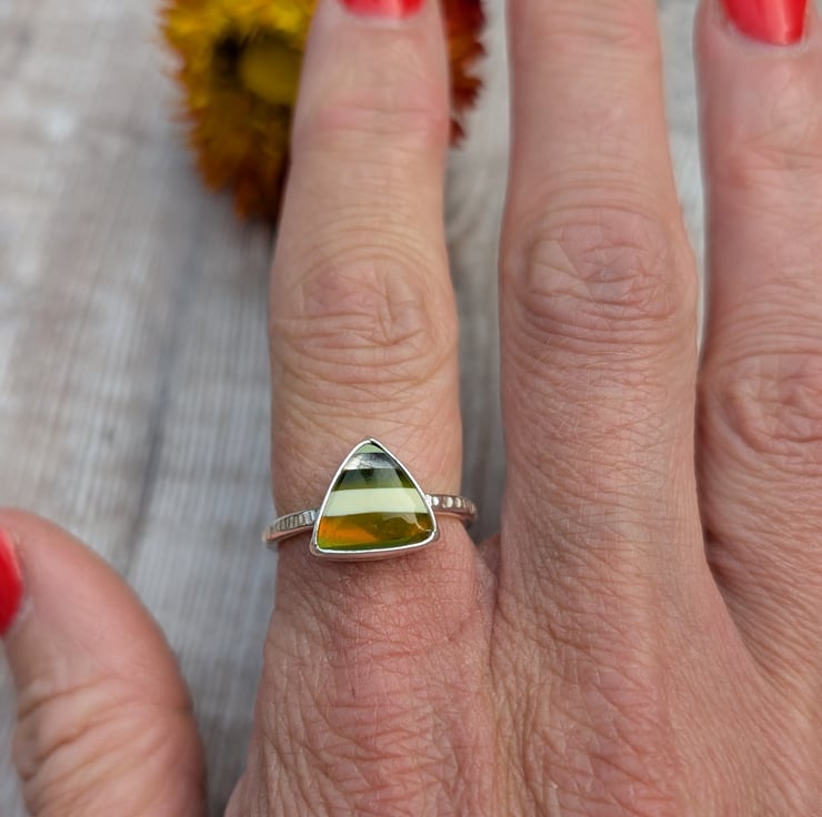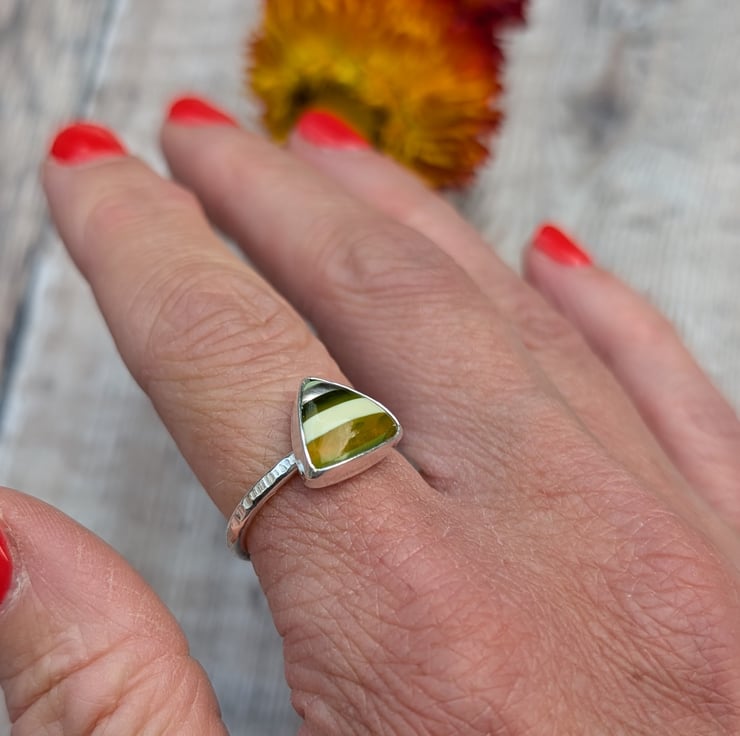 This handmade ring features a one-of-a-kind Surfite stone with striking horizontal stripes in shades of olive green, white, and amber. The recycled sterling silver setting complements the triangle-shaped Surfite, which measures approximately 11mm. A lightly hammered band adds extra detail and texture.