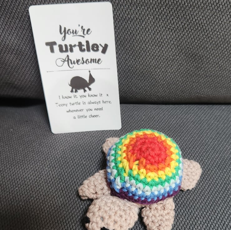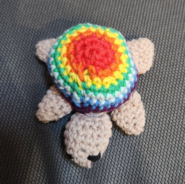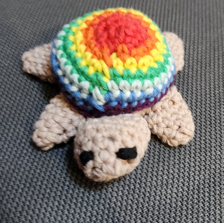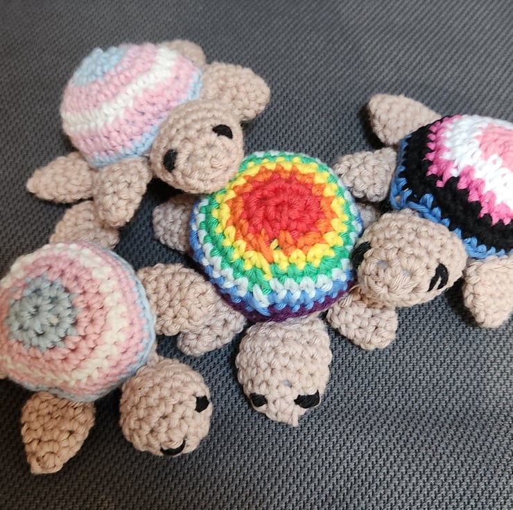 A cute amigurumi turtle hand made in cotton yarn . The shell is in the colours of the Pride flag. It measures approximately 9cm from it's head to back of its shell. Stuffing is polyester toy wadding.