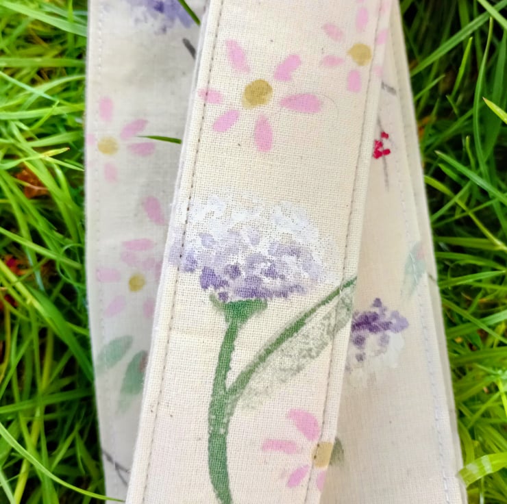 Not made from ready printed fabric, the delicate, pastel florals have been hand-painted, free-style, onto a light linen to create a one of a kind patterned fabric. In this case only one strap was made from the fabric so there may, one day, be straps similar but there will never be one exactly the same. It is totally unique.