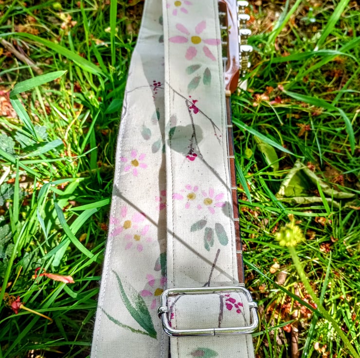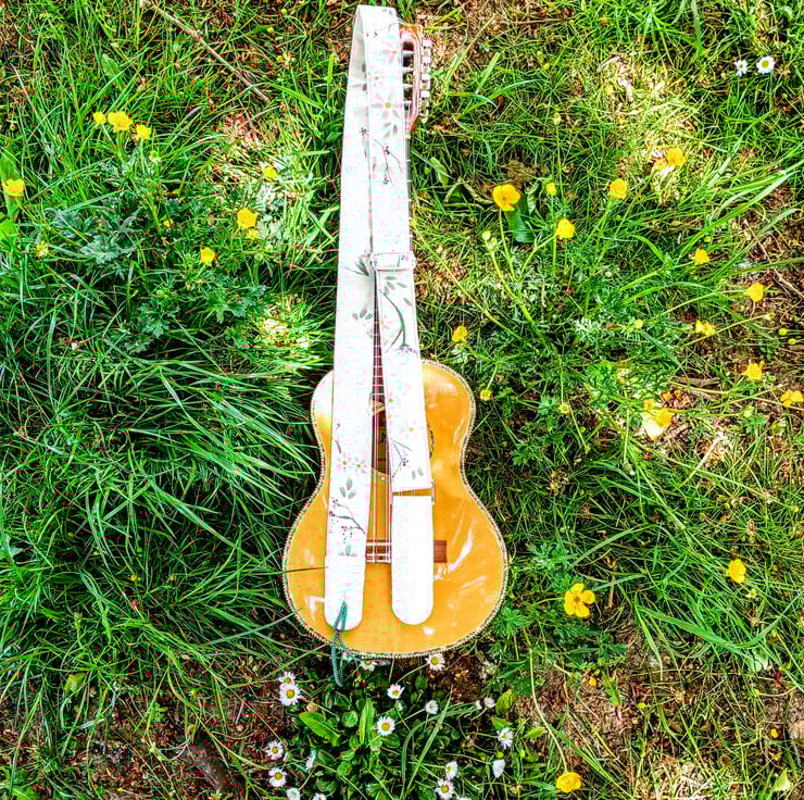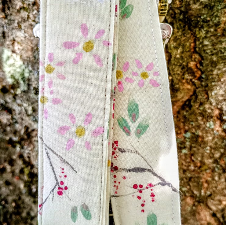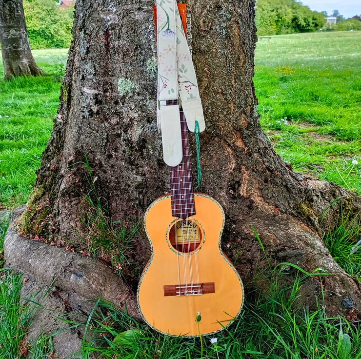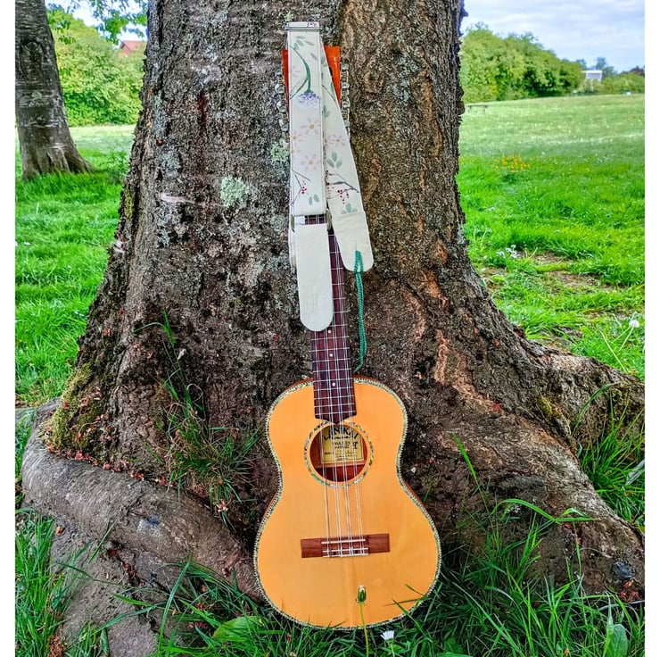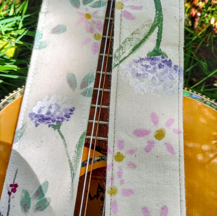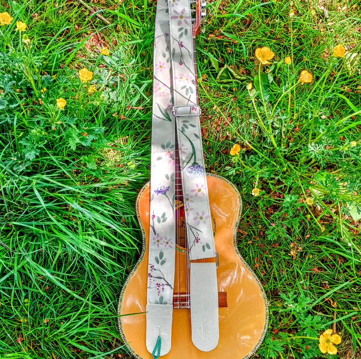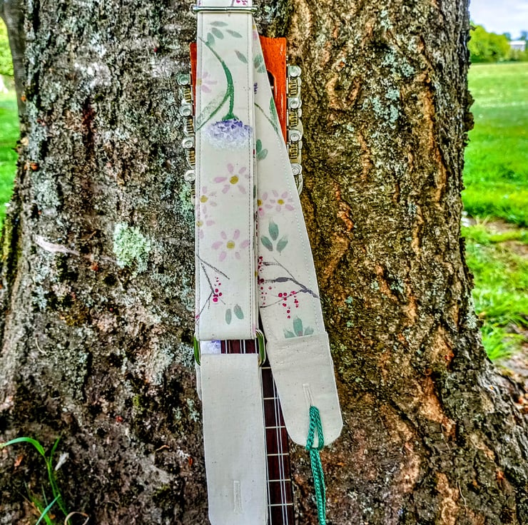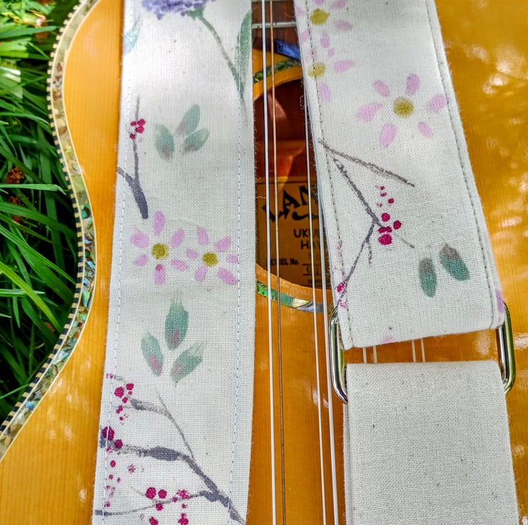 The strap ends are hand-made in a matching linen and I have included a free crochet 'shoe string' that is designed to be the perfect length for a ukulele. In this case it is a gentle, sage green to complement the leaves and stems of the plants.