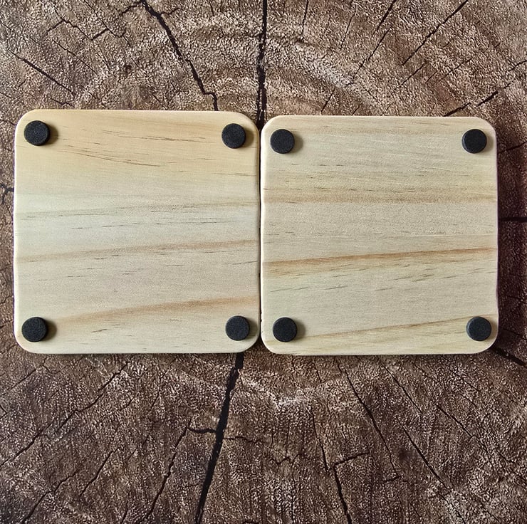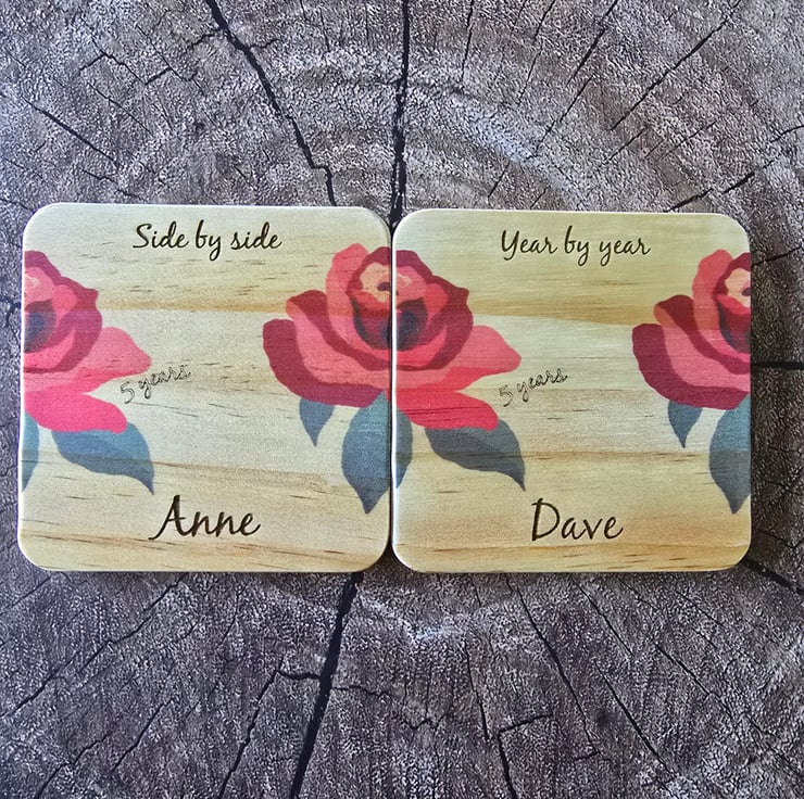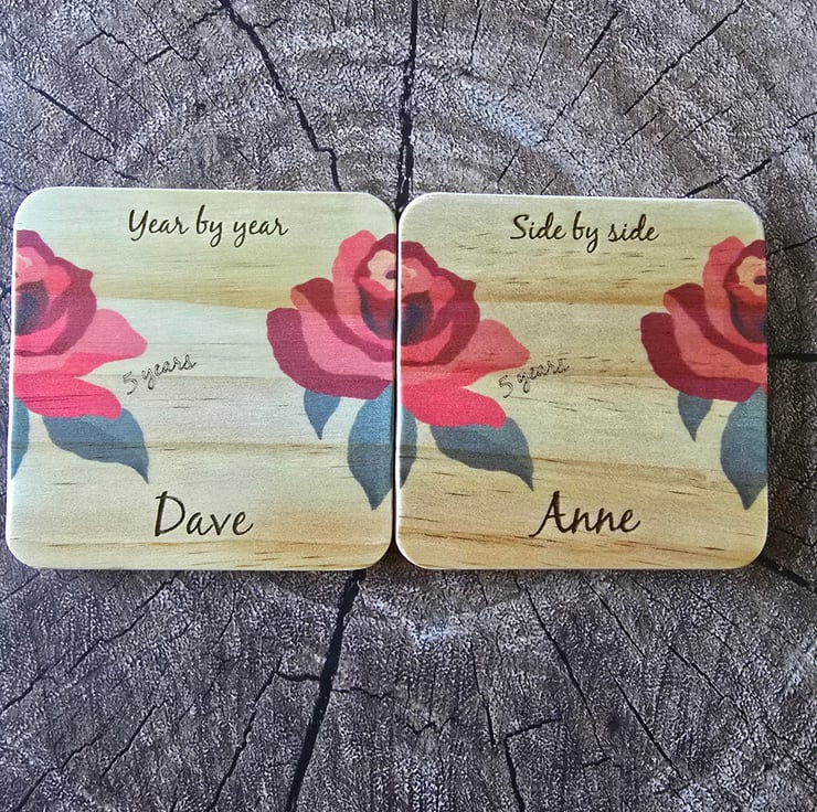 This pair of coasters a made of plywood with 4 foam coasters on the base. Text can be personalised with names. The year number can be personalised if you wish or removed. They are printed and engraved plus finished with varnish to help protect. They can be personalised to add whatever text you want. They are made to order. Each coaster is 10x10x0.8cm.