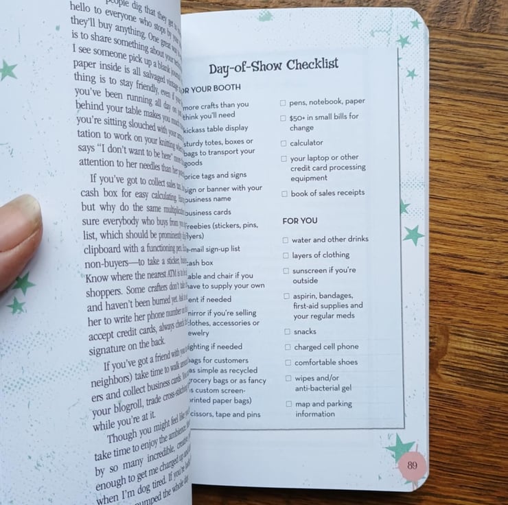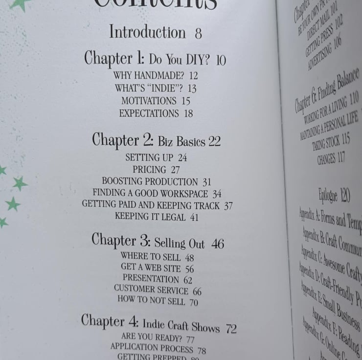 The book starts by asking you to think about why you craft and what are your expectations of a craft business, then covers practicalities about business basics, where and how to sell, prepping for an in-person craft fairs, promotion and advertising, and finding a life balance. There are lots of useful forms and templates too.