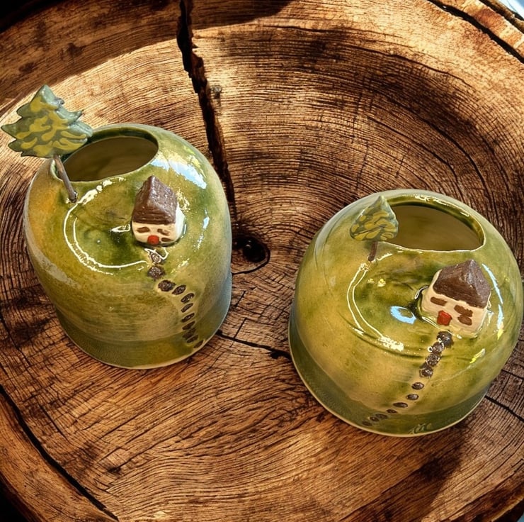 This charming small posey vase, titled 'House on the Hill', is hand-thrown on the potter’s wheel and finished with whimsical detail. Each piece features a handcrafted little cottage and tree added with care, making every vase truly one-of-a-kind.