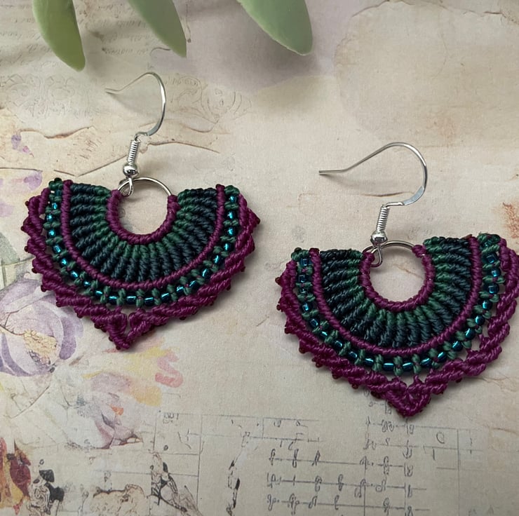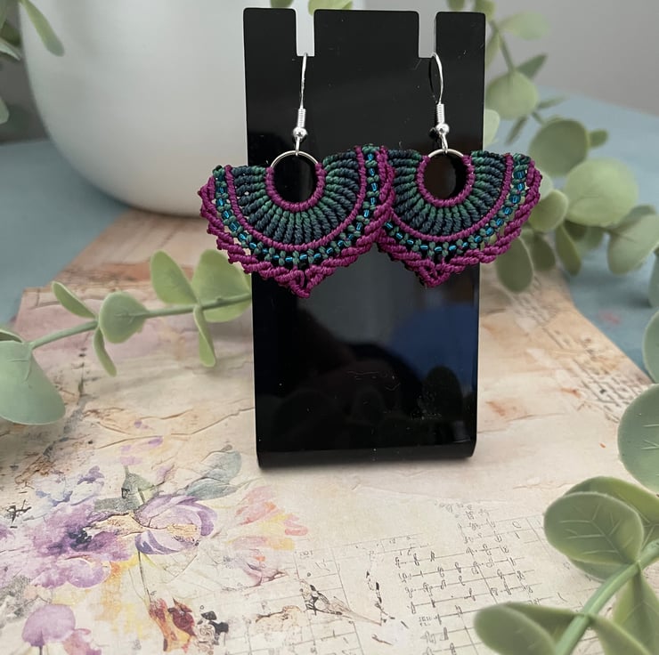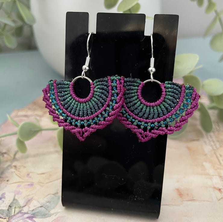 Designed and created by me in my Kent studio in pretty shades of purple, magenta and mauve interwoven with tiny glass seed beads and using unbreakable c-lon macrame thread which makes them very light weight but makes a big statement .