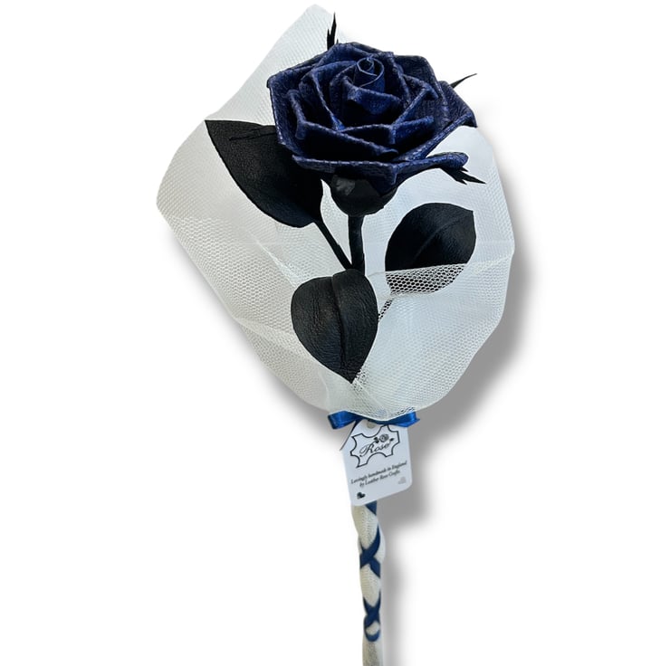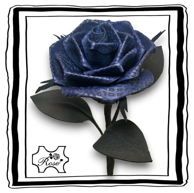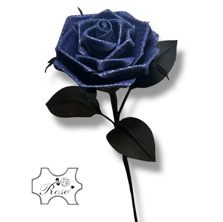 A long stem, dark blue leather rose with black leather leaves and stem. Handcrafted with love and passion. There’s a little mischief in its patterned petals, just a hint of whimsy and magic!