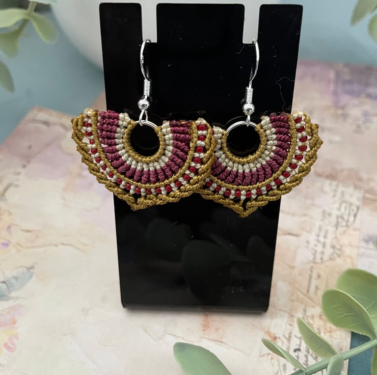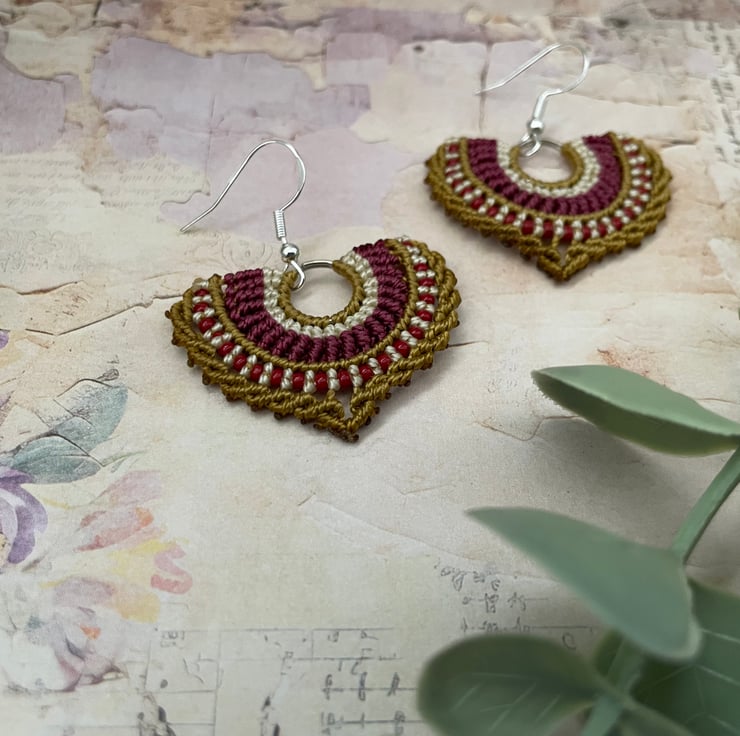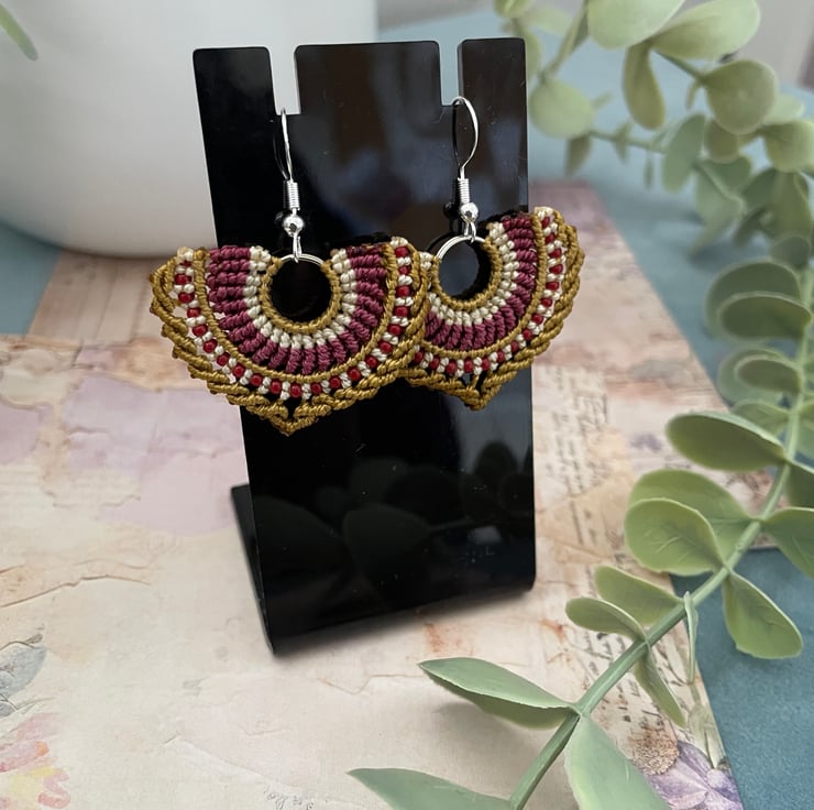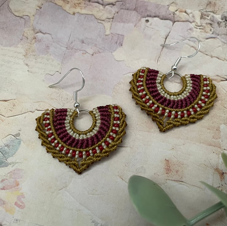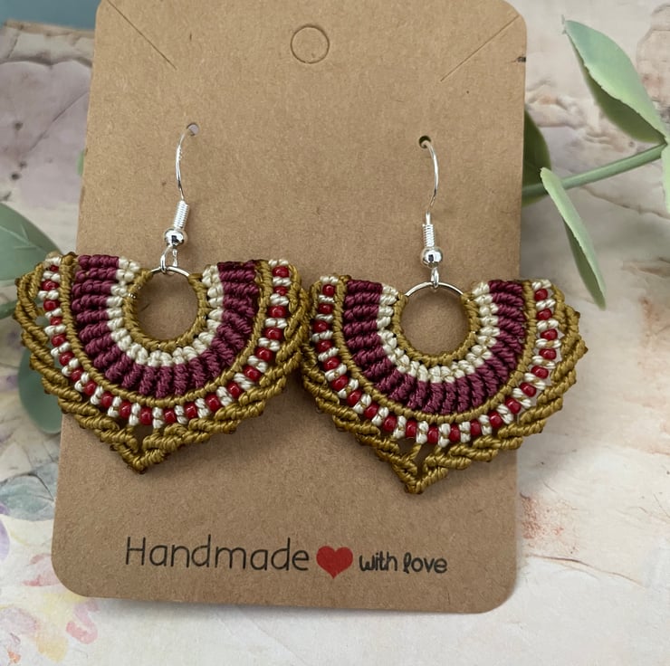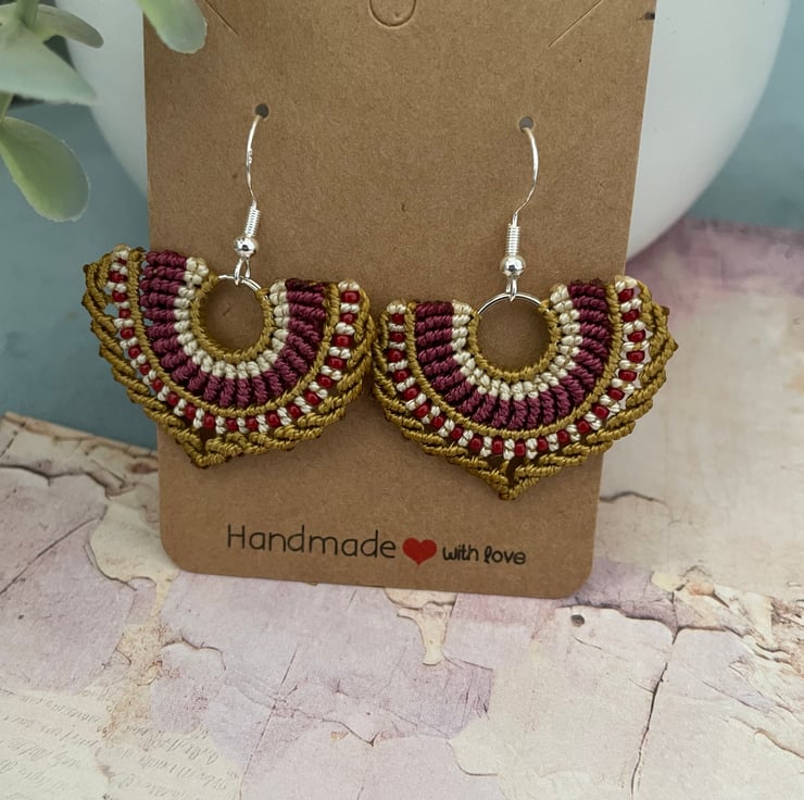 Designed and created by me in my Kent studio in pretty shades of cream, maroon and gold interwoven with tiny glass seed beads and using unbreakable c-lon macrame thread which makes them very light weight but makes a big statement .