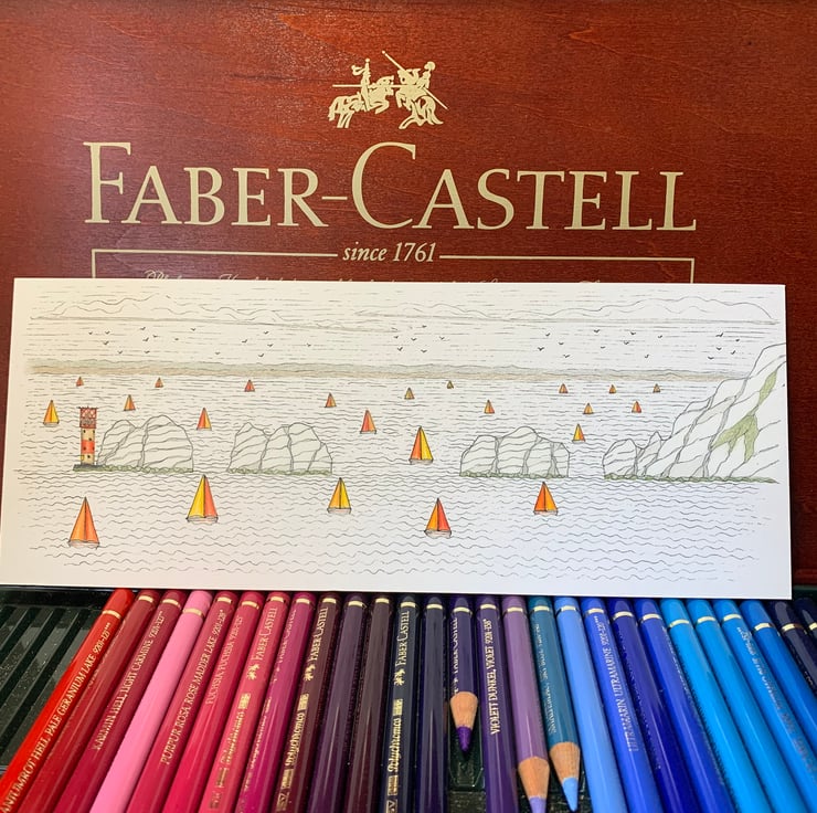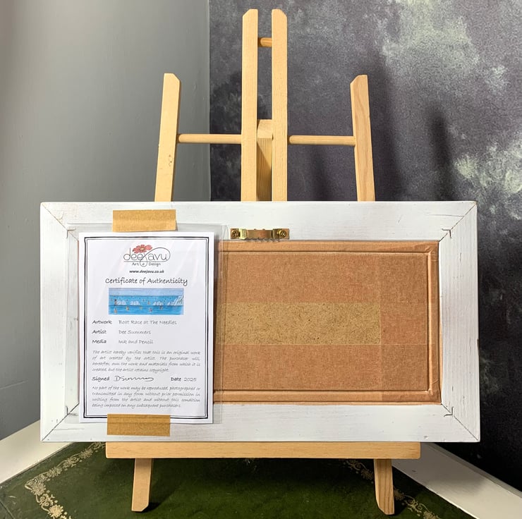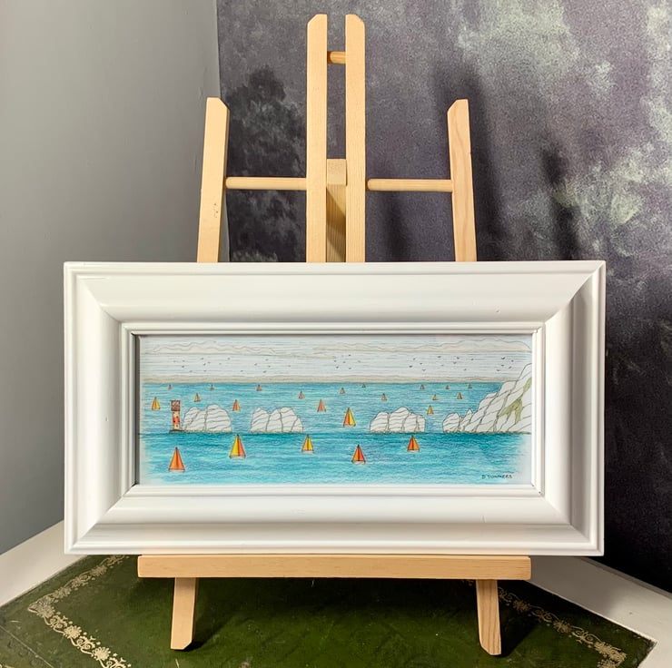 Boat Race at The Needles, Isle of Wight. This original work of art features many brightly coloured yachts sailing around The Needles Lighthouse and rock formation. The drawing is framed in a chunky solid pine frame that has been painted white. Hand-drawn using ink and pencil, the complete artwork, including frame, measures approximately 34 x 19 cm (13 x 9 inches). The artwork will come with a certificate of authenticity signed by the artist.