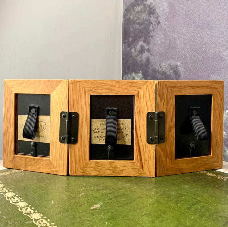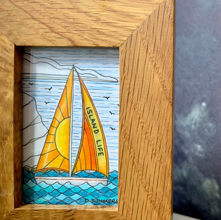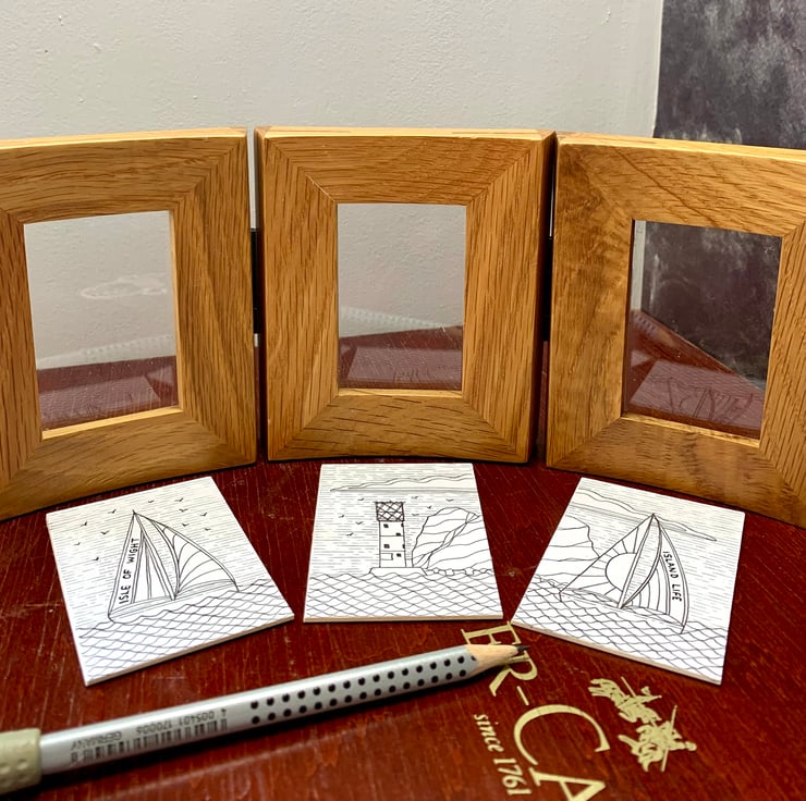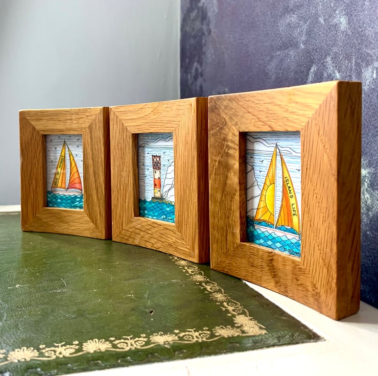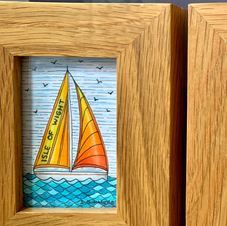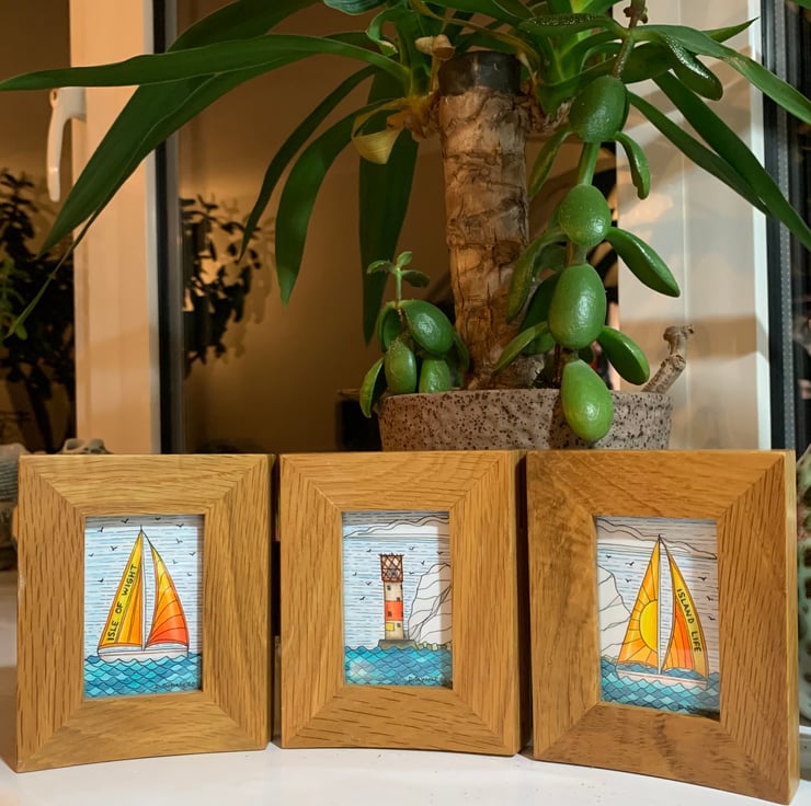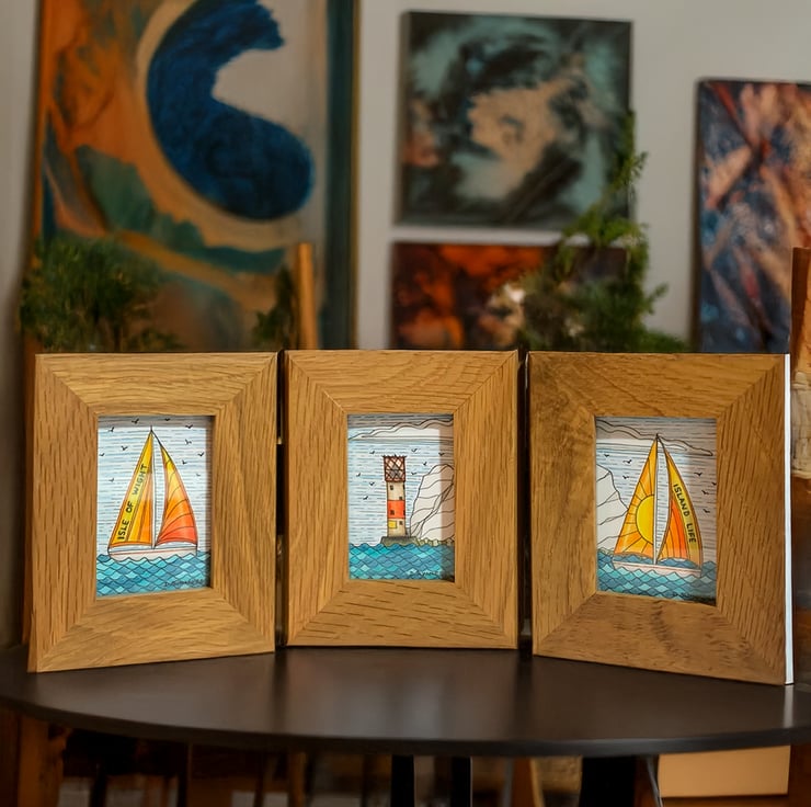 The sailboats are adorned with the inscriptions 'Isle of Wight' and 'Island Life', adding a personal touch to the scene. Each drawing measures approximately 7 x 5 cm (3 x 2 inches) and is elegantly presented in a reclaimed solid oak frame with three apertures. The frame, measuring about 30 cm in length and 11.5 cm in height, is hinged, allowing it to stand freely on a shelf or mantelpiece without additional support.