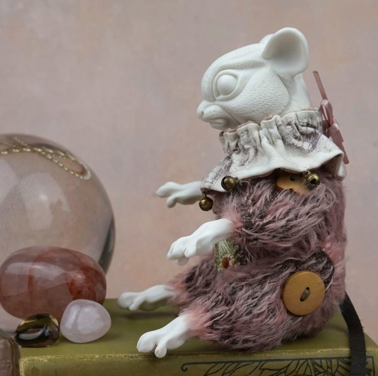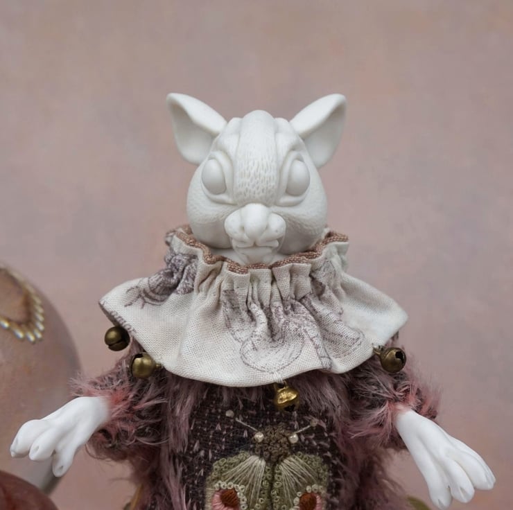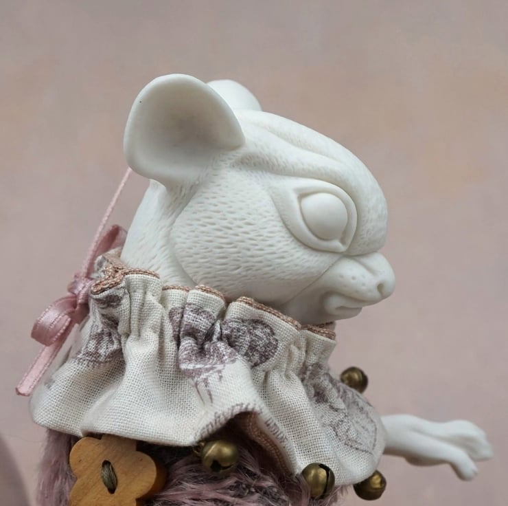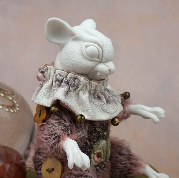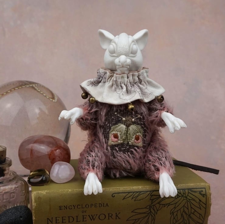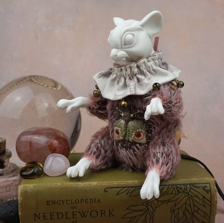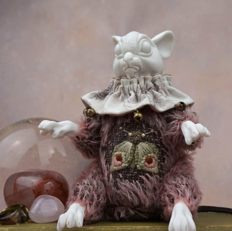 Brindle's head has been carved with fur, and – like her paws – is a glacier porcelain. Her body is pink mohair, her buttons wooden, and her tail a black leather. The jester’s collar about her neck is a moth-themed Tim Holtz cotton fabric trimmed with bronze bells. Brindle is made to be seated, however her limbs move at hip and shoulder. For her heart stone we chose a leopard skin jasper – a wonderful pink stone mottled like moth wings.
