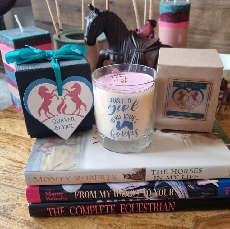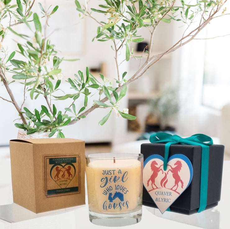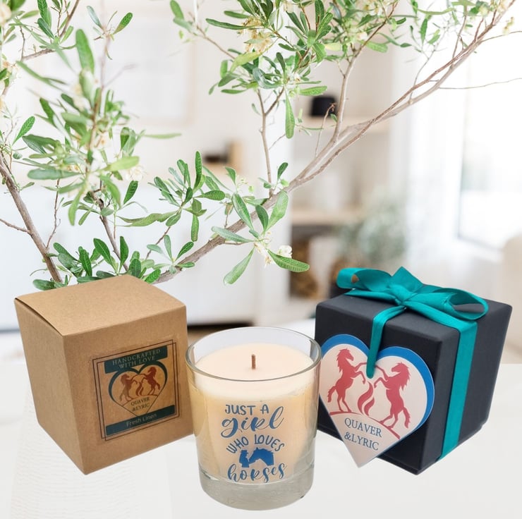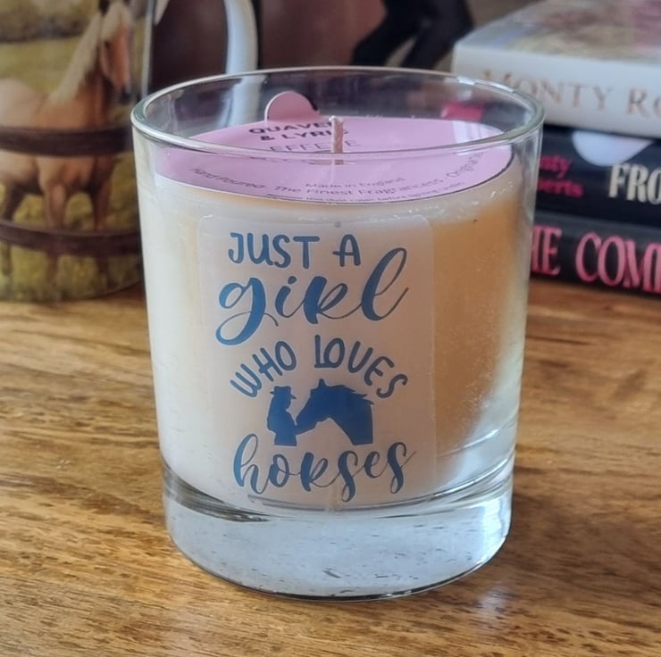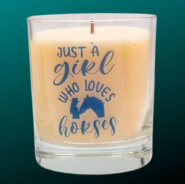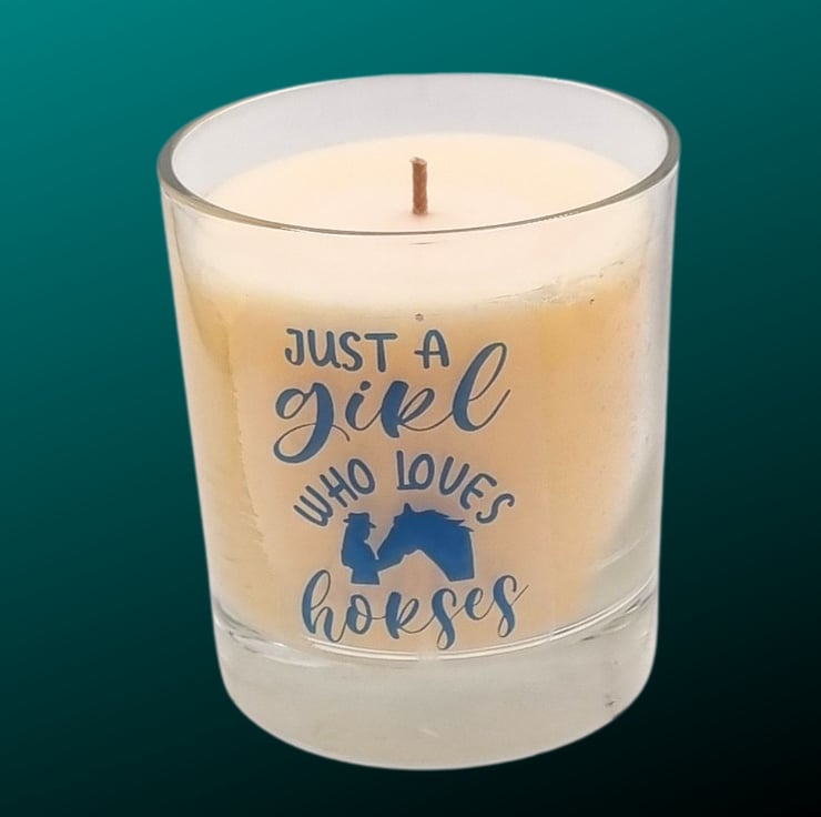 A beautifully scented candle with the message Just A Girl Who Loves Horses. Handmade in Northamptonshire using a high quality rapeseed and mineral wax blend, the finest range of premium fragrances, hand-poured into quality glass containers and supplied in a kraft box. The design on the scented candle is made from permanent printed waterproof vinyl which can be cleaned (hand wash only) allowing the glass to be re-purposed as part of your home decor after the candle has burned.
