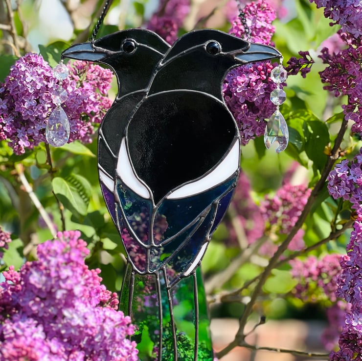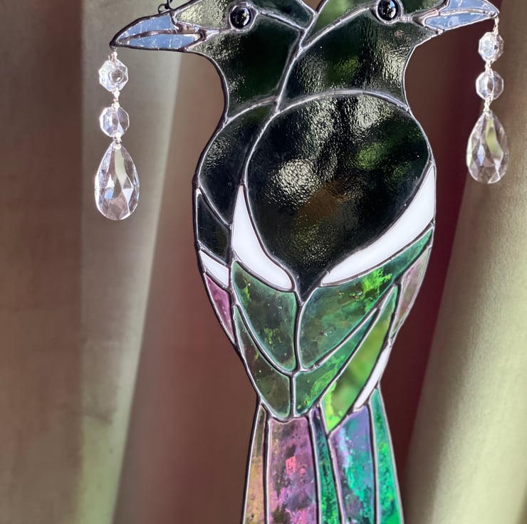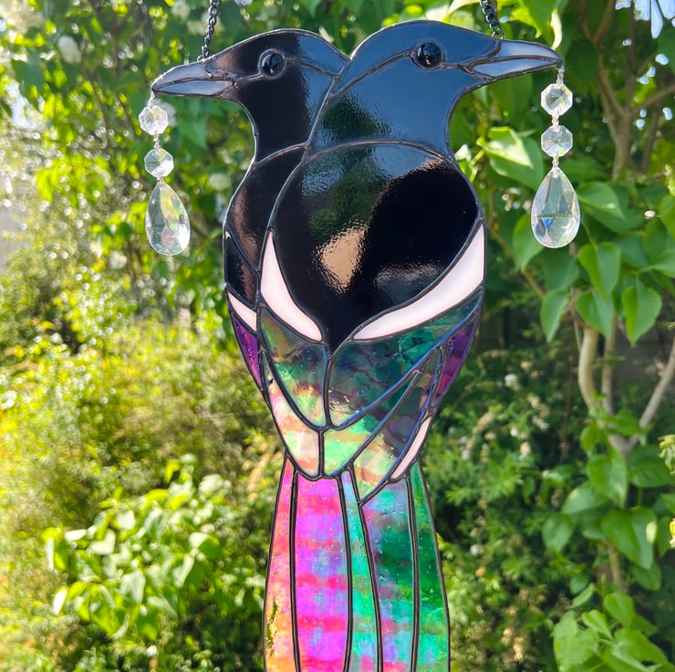 Stained Glass Magpies - iridescent leaded bird with antique crystal vintage