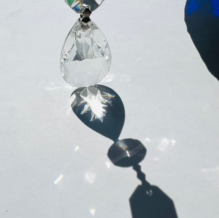 The stained glass magpies are made in translucent, iridescent green, and blue paired with a glossy black opaque glass. Each magpie carries a drop of 3 antique Victorian cut glass crystals and is finished with a glossy black patina.