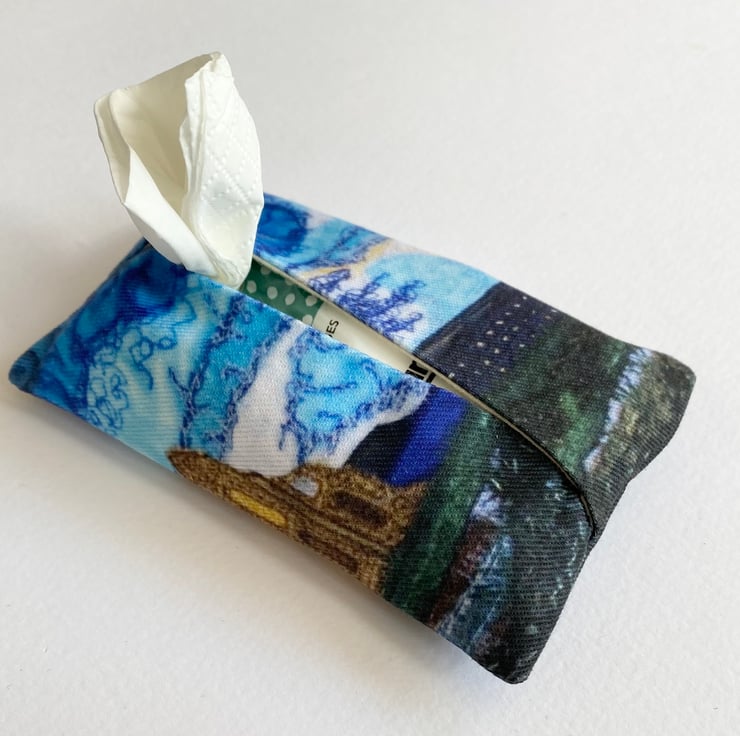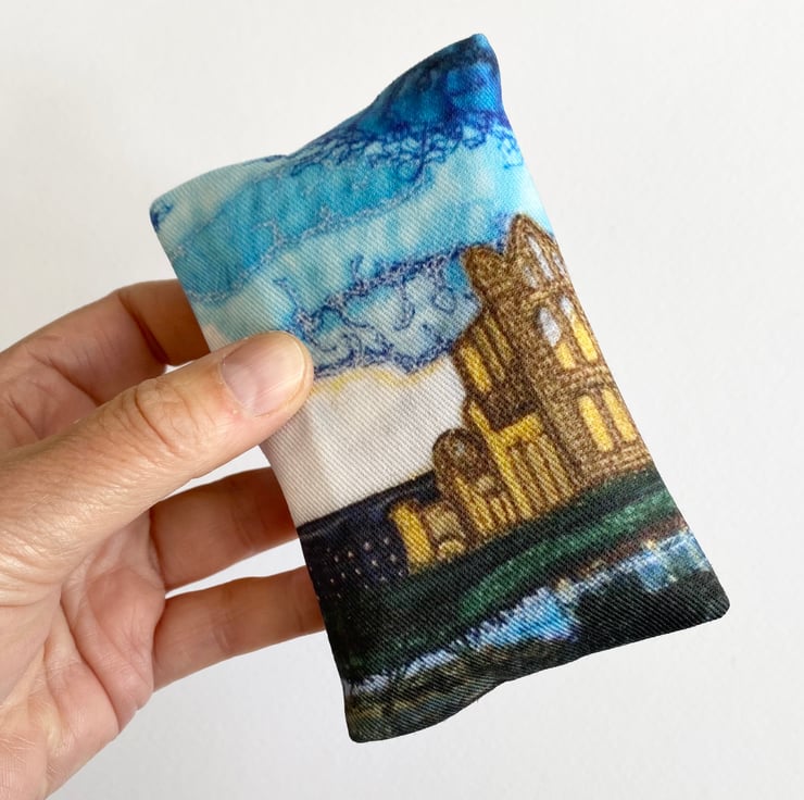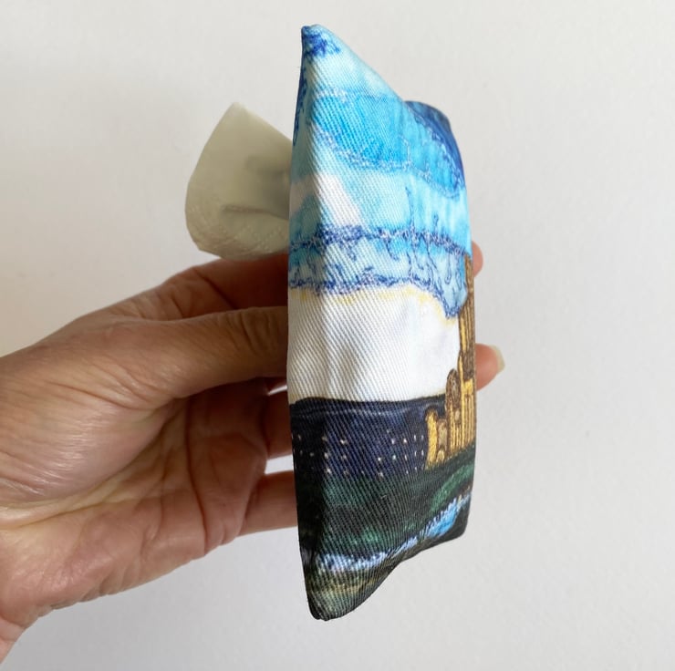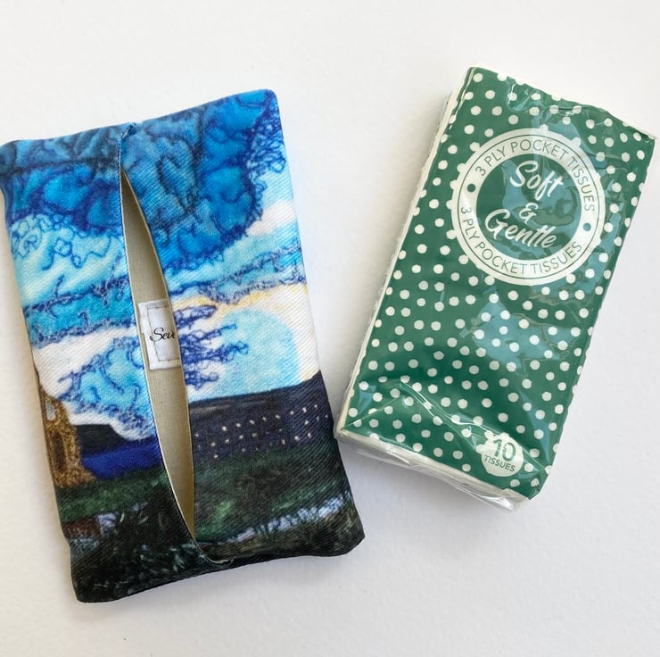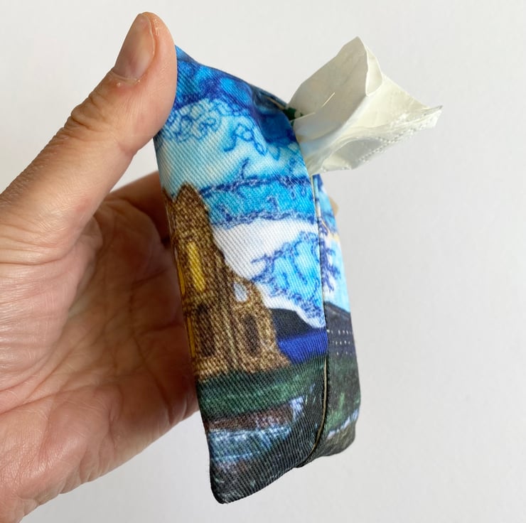 This pocket or bag tissue pouch/holder has been made using one of my Yorkshire prints. This one shows a dramatic view or Whitby Abbey, with the town and moor behind. The case is lined. Ideal for popping tissues in and handy for dog poo bags too. It’ll easily fit in your pocket or bag.