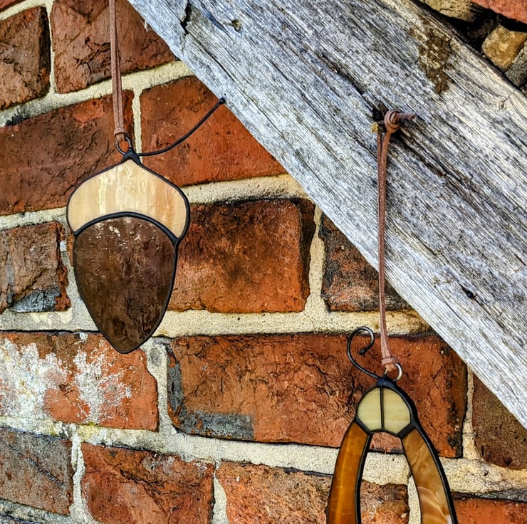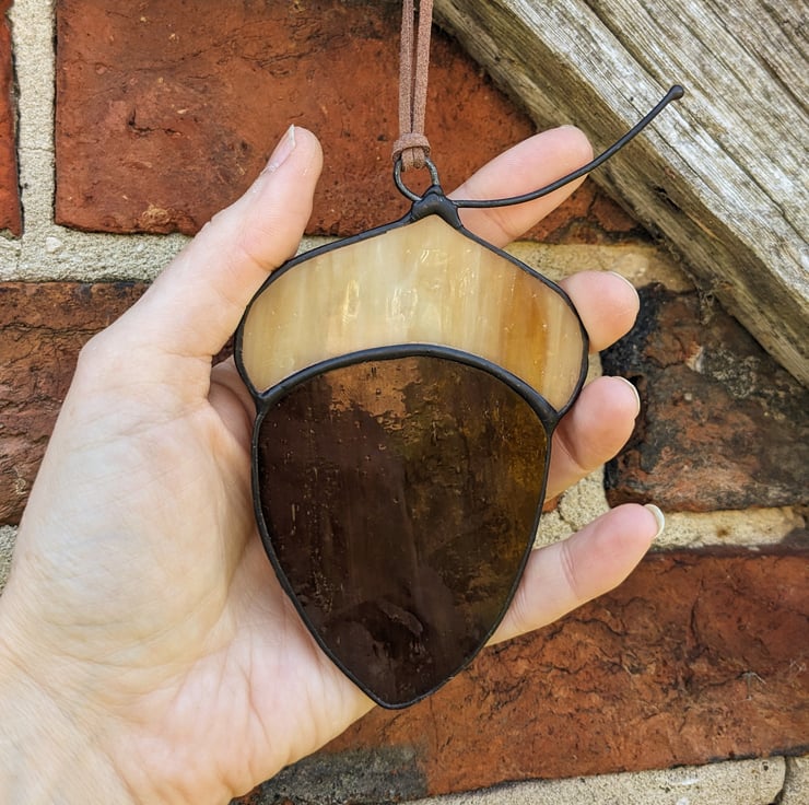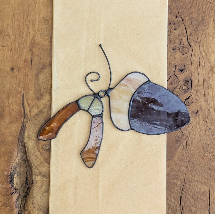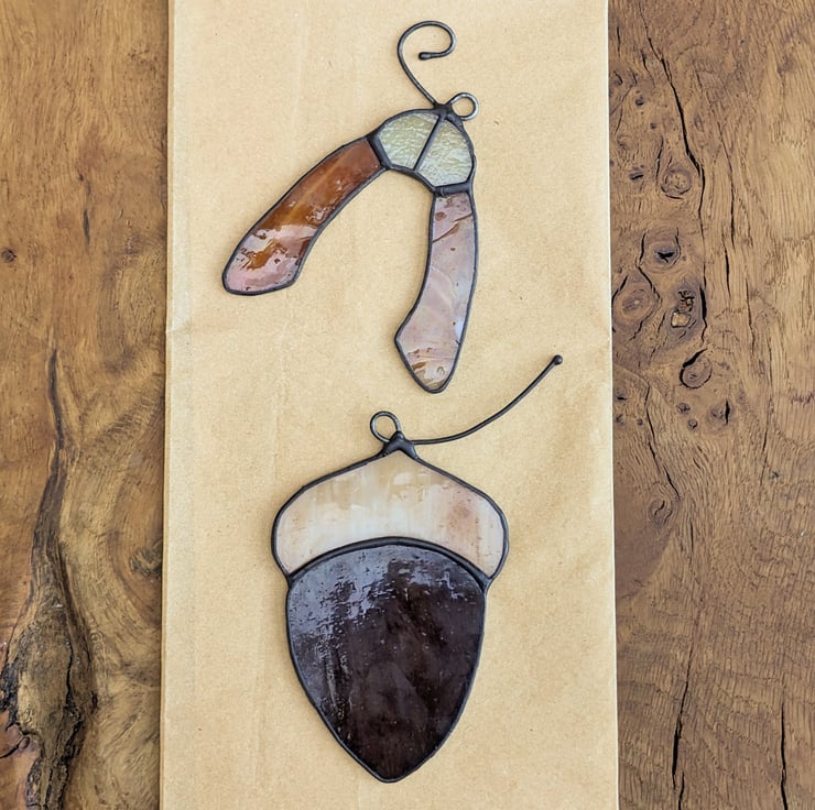 A stained glass Acorn or Sycamore Seed suncatcher, created using the copper foil Tiffany technique, made in autumnal shades of glass.
