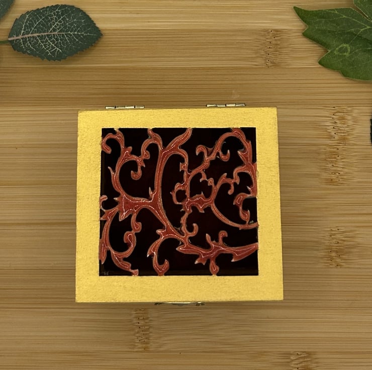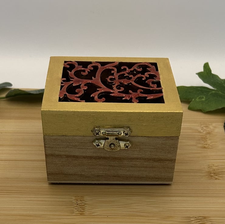 Set of 7 resin Chakra stones, rounds or medallions in a rich deep red and gold colour. Made from eco friendly resin from a trusted UK supplier and hand painted with gold acrylic paint. Each stone has a hand painted Chakra symbol and the set comes with a half painted box, the other half has been polished using beeswax to protect it and add a lovely sheen. The lid has a cut out design and the top has been top coated in coloured resin. The inside of the lid has been hand painted again and the bottom lined in felt fabric as has the bottom of the box.