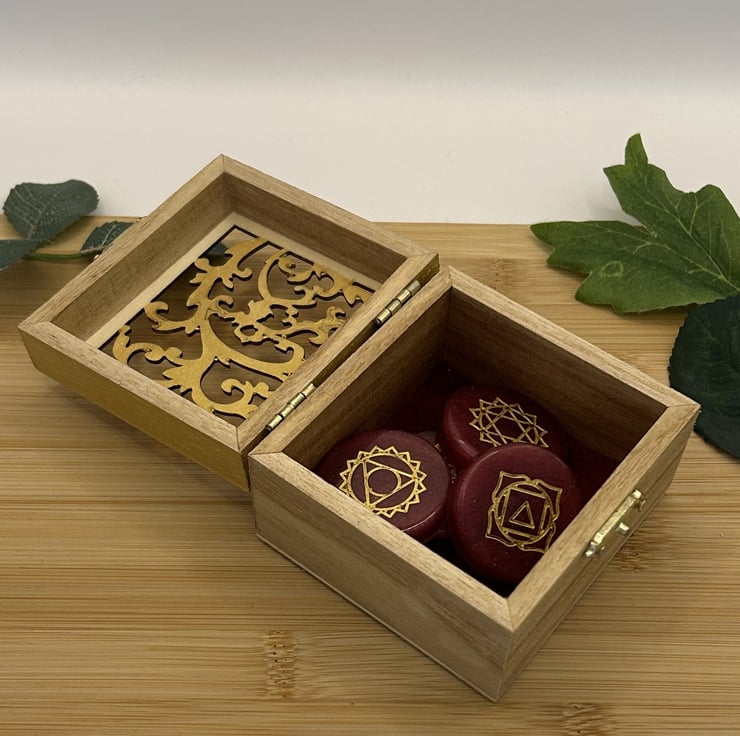 This is the first Chakra set in my Spiritual and Wellbeing section. I wanted to make a set of Chakra stones with a unique matching storage box and opted for red and gold as they work so well together.