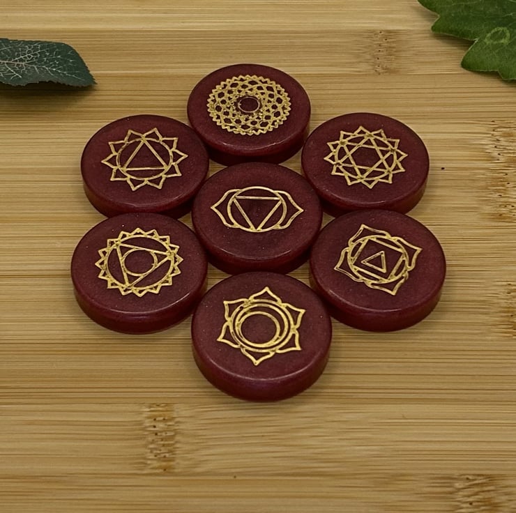 Each resin stone or round is embedded with a Chakra symbol representing the 7 Chakra energy centres on the body: