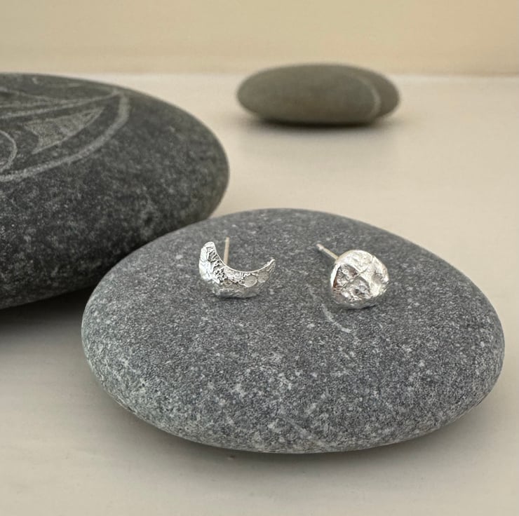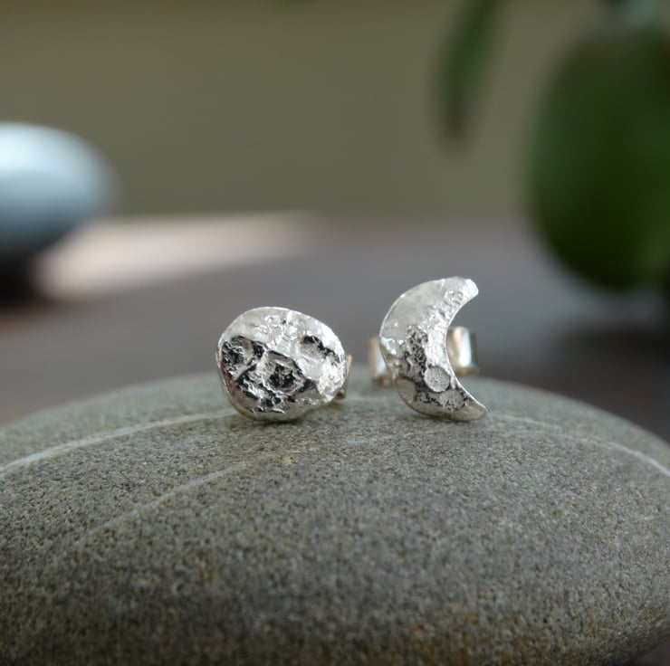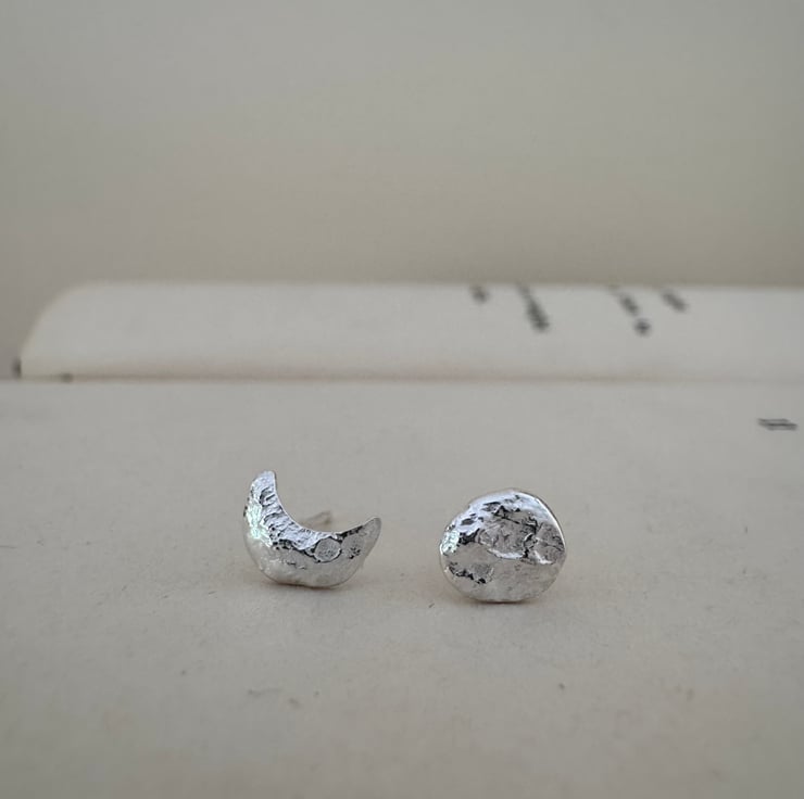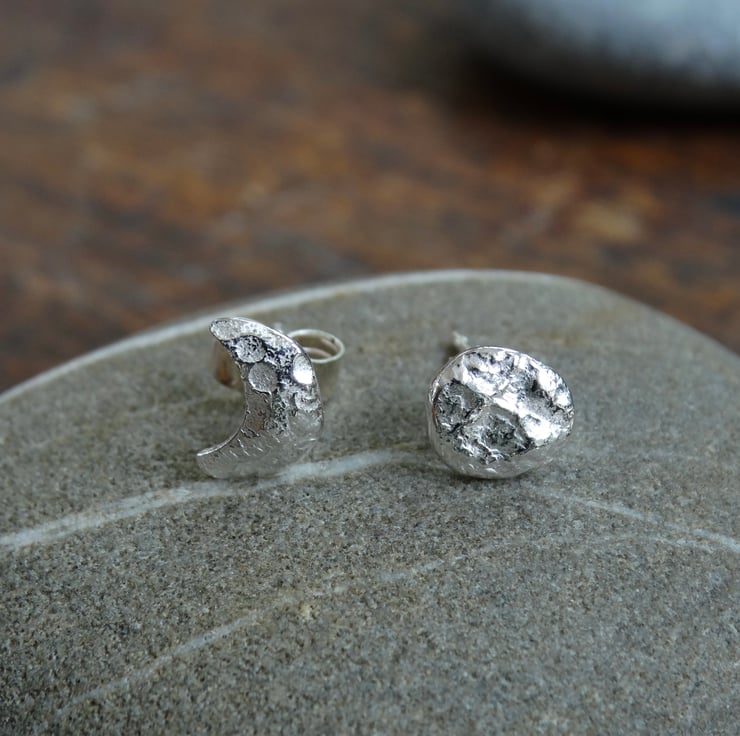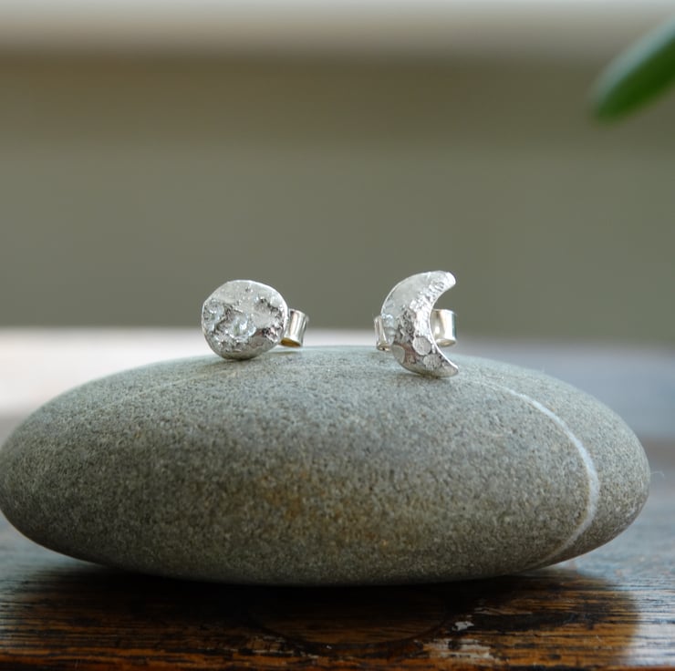 These tiny moon studs - one crescent moon and one full moon - have been crafted by hand in 100% recycled sterling silver.