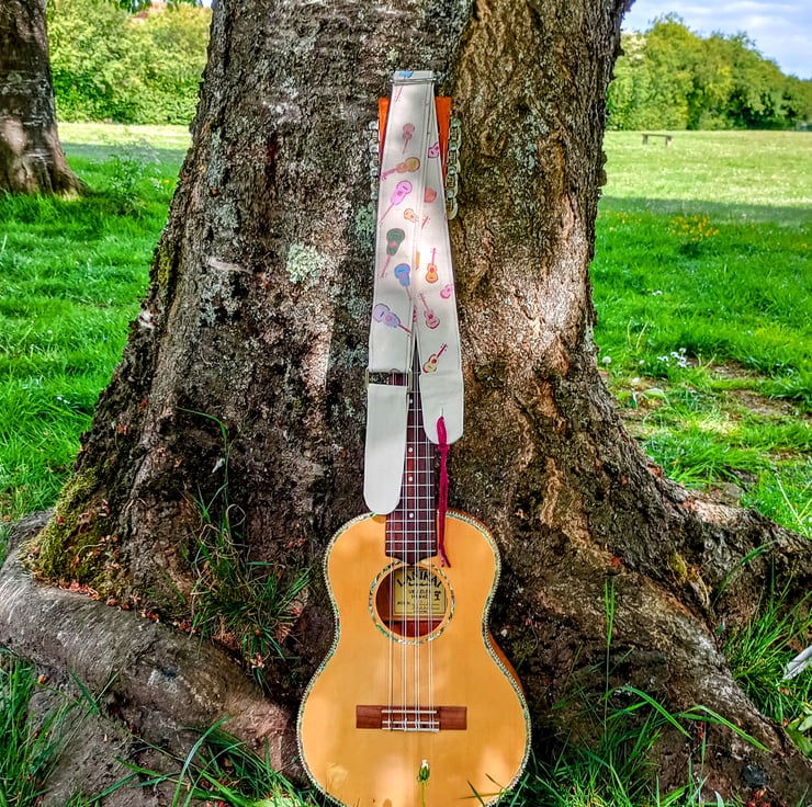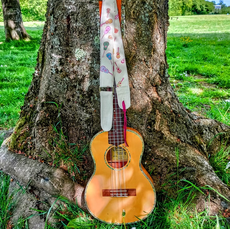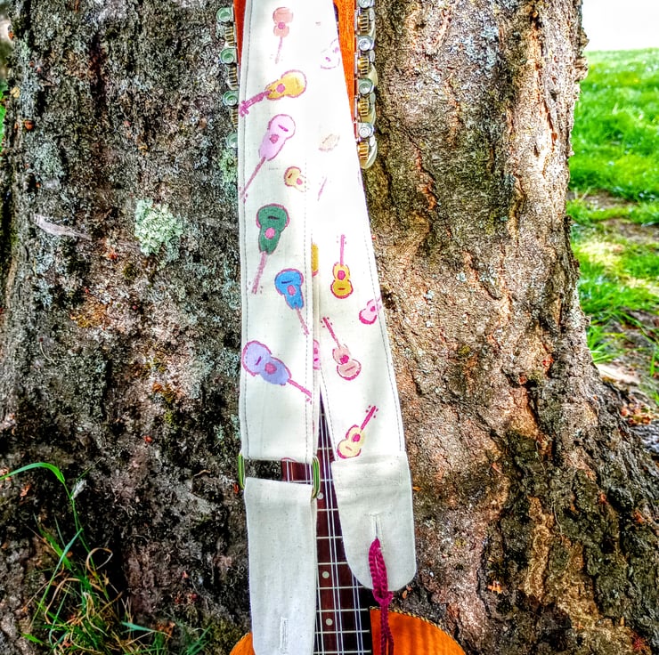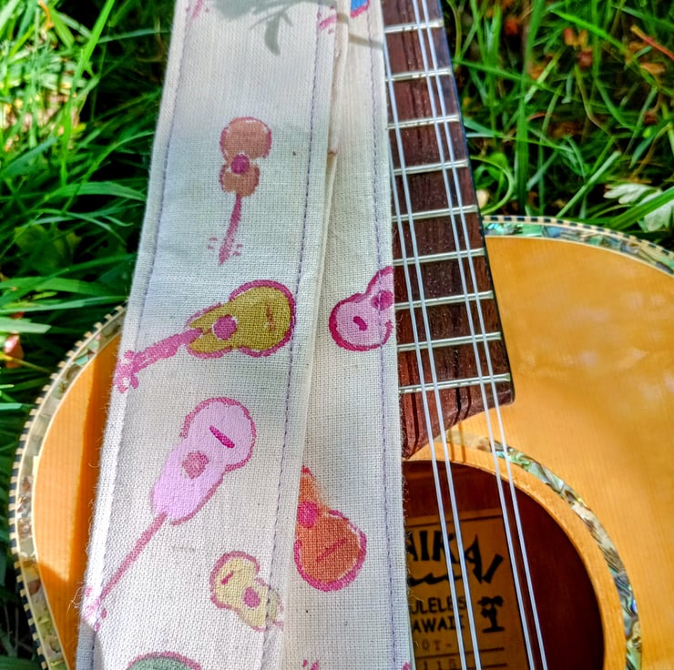 Ukuleles are so appealling. The iconic little size and the beautiful, curvy shape are crying out to be used as a fabric pattern design and where better to use that fabric than in a strap to hold up a uke?