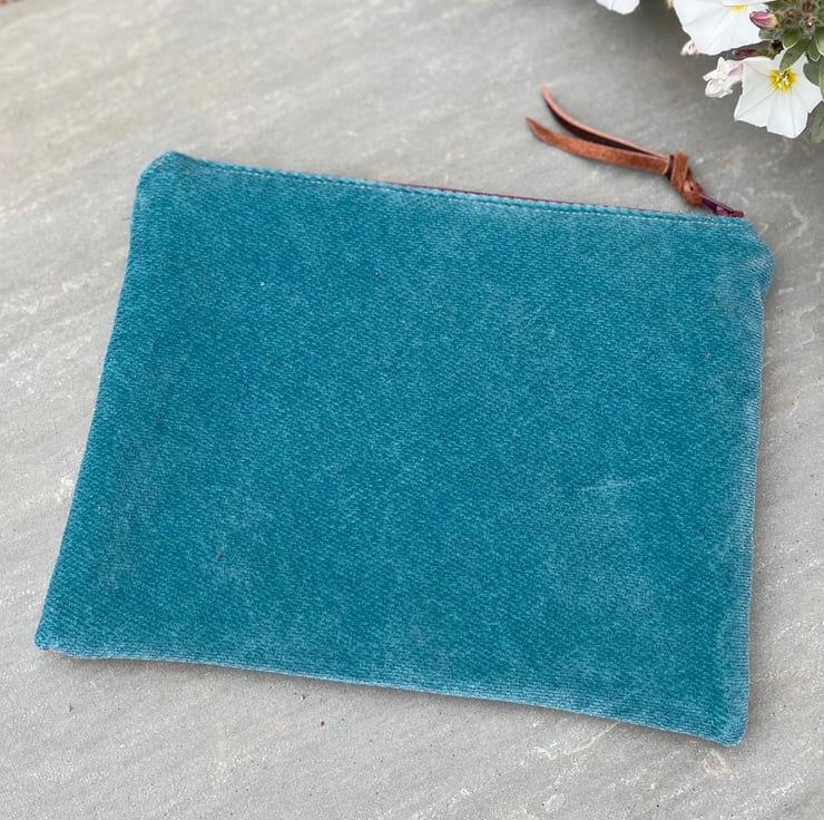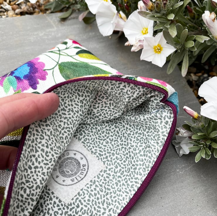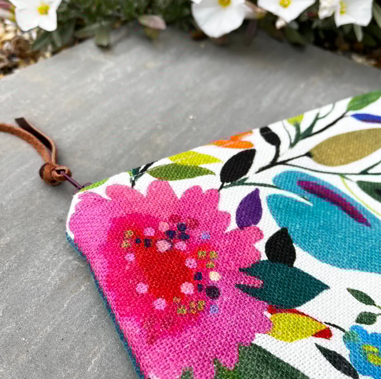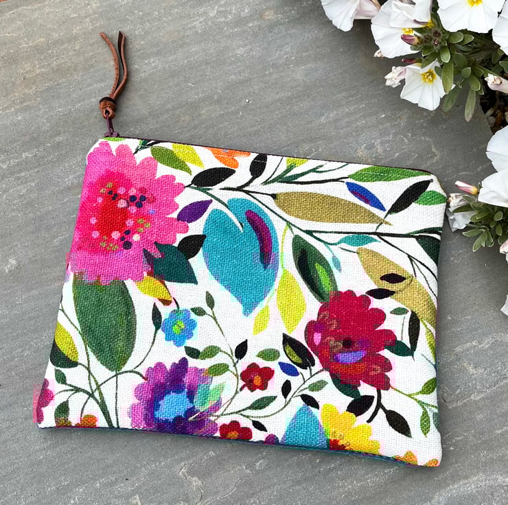 Bright floral linen zip pouch. This little bag has been made from Ariadnes Dream linen with its beautiful floral pattern on a cream background. It is backed with velvety teal moleskin fabric from a sample swatch leftover from the fashion industry. The pouch is fully lined with tiny leopard print.