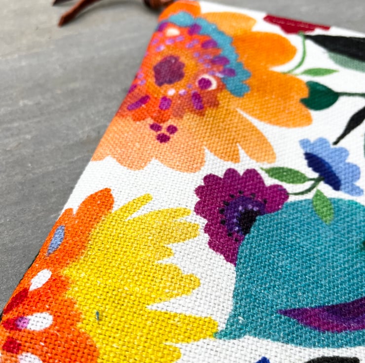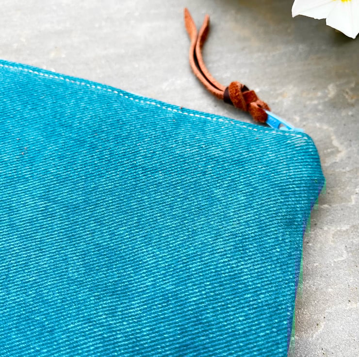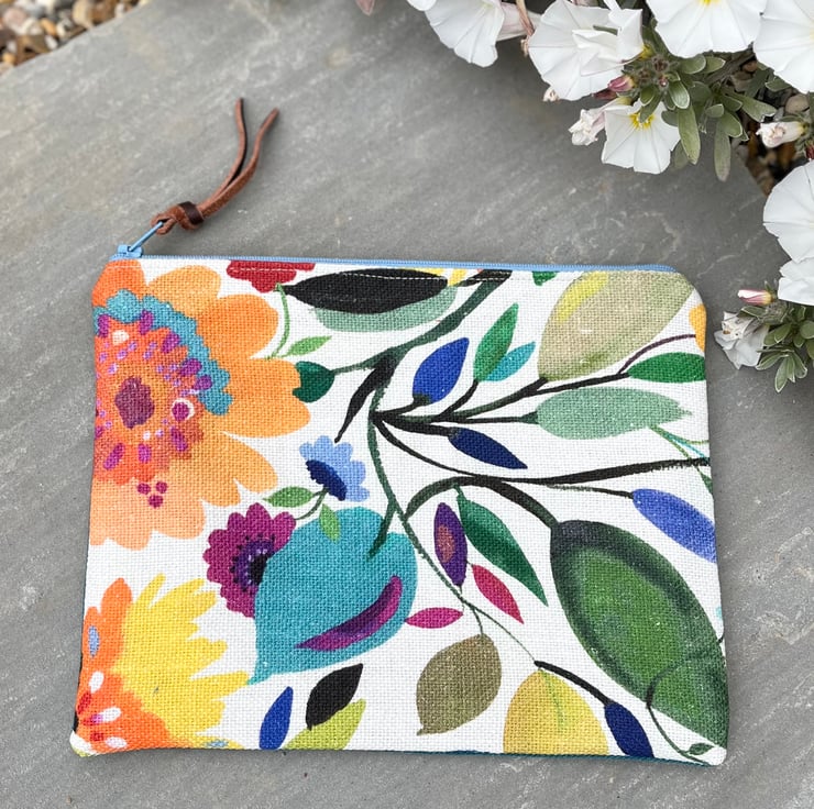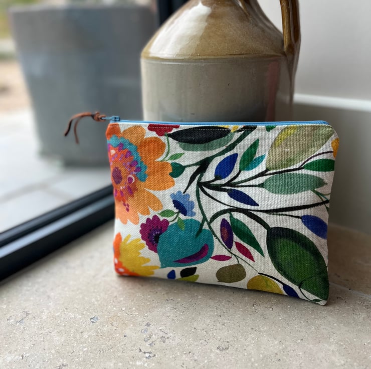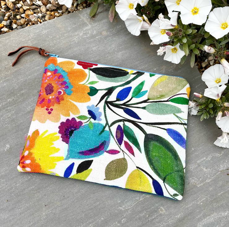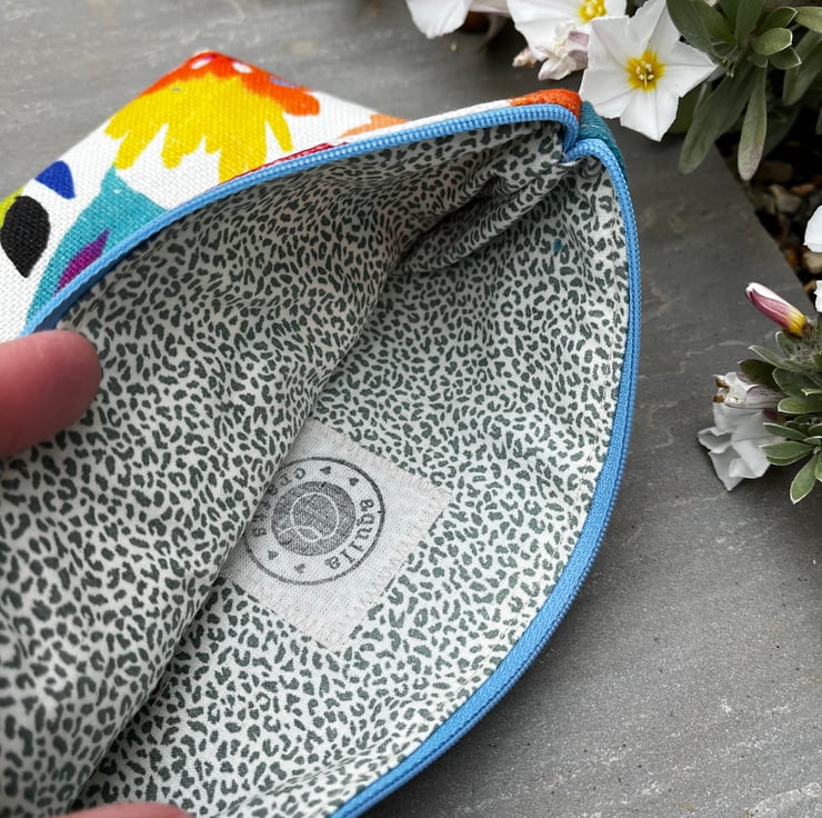 Bright floral linen zip pouch. This little bag has been made from Ariadnes Dream linen with its beautiful floral pattern on a cream background. It is backed with teal twill fabric from a sample swatch leftover from the fashion industry. The pouch is fully lined with tiny leopard print.