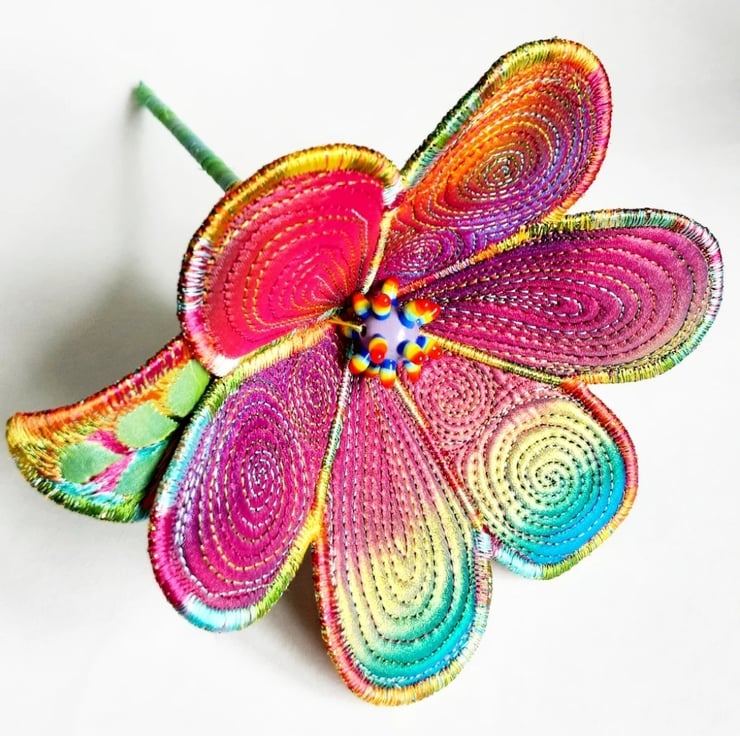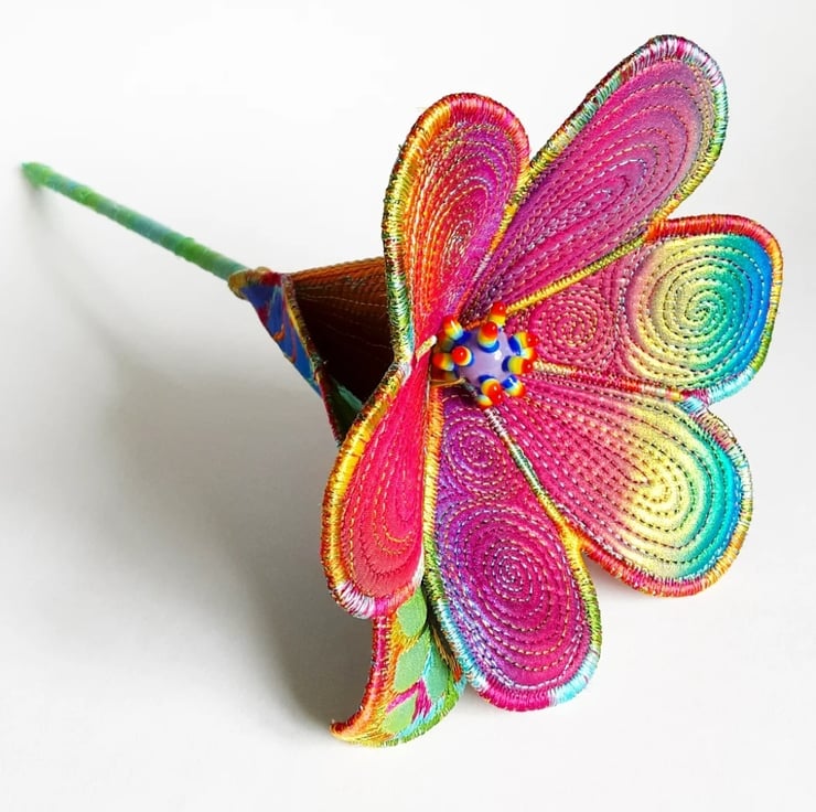 It has a flower with a rainbow glass bead in the middle, a green leaf coming out of the side and a wooden stem wrapped in green fabric.