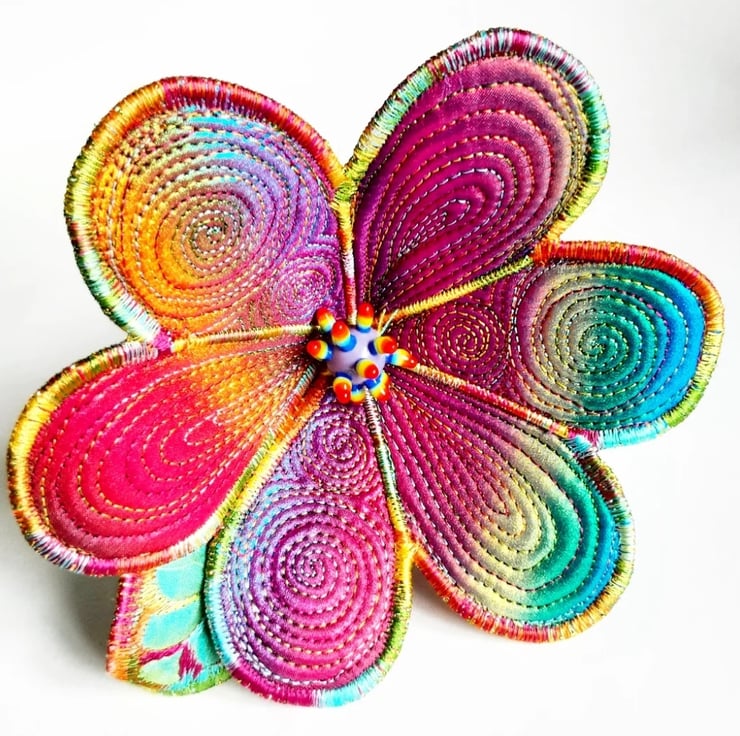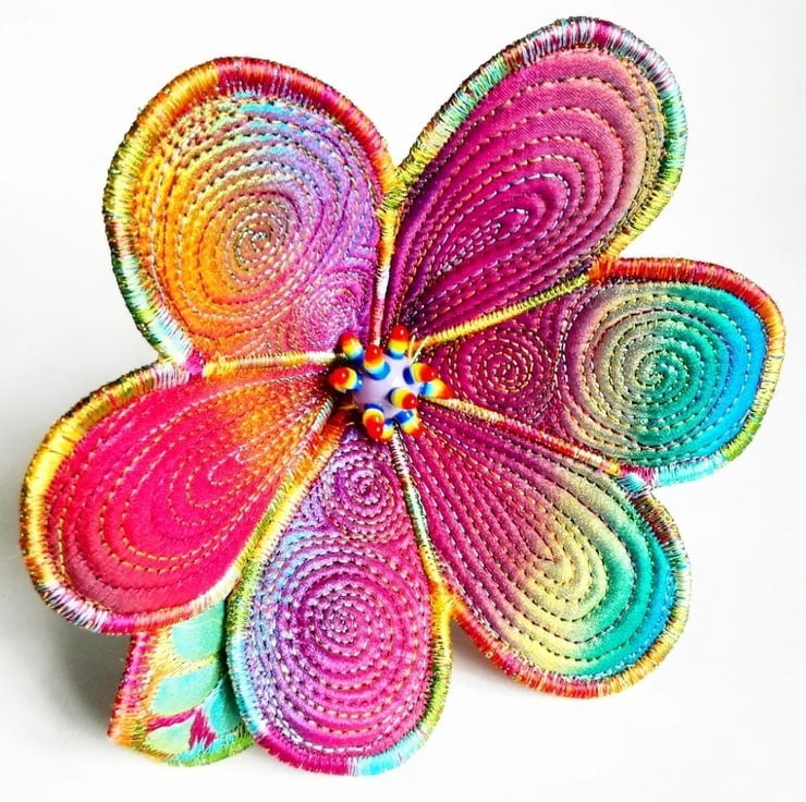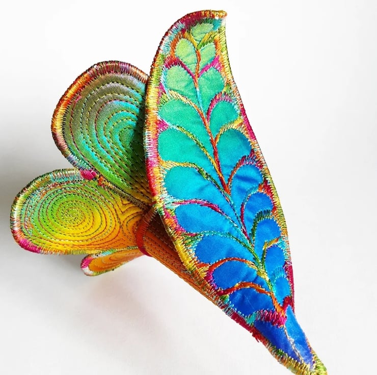 Made from layers of fabric including hand dyed Egyptian cotton and silk fabrics using the free machine embroidery style of sewing