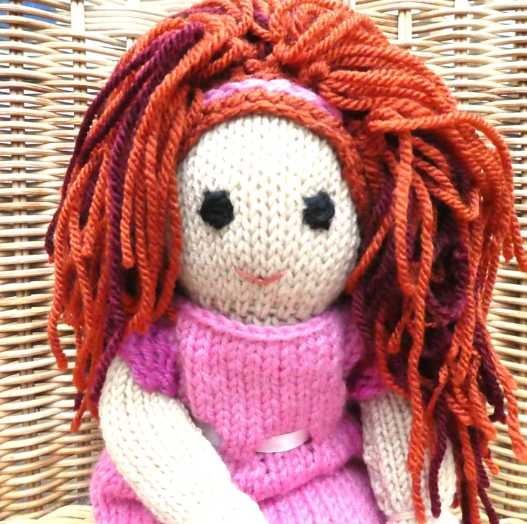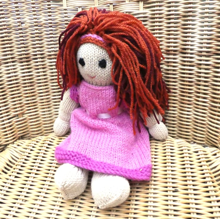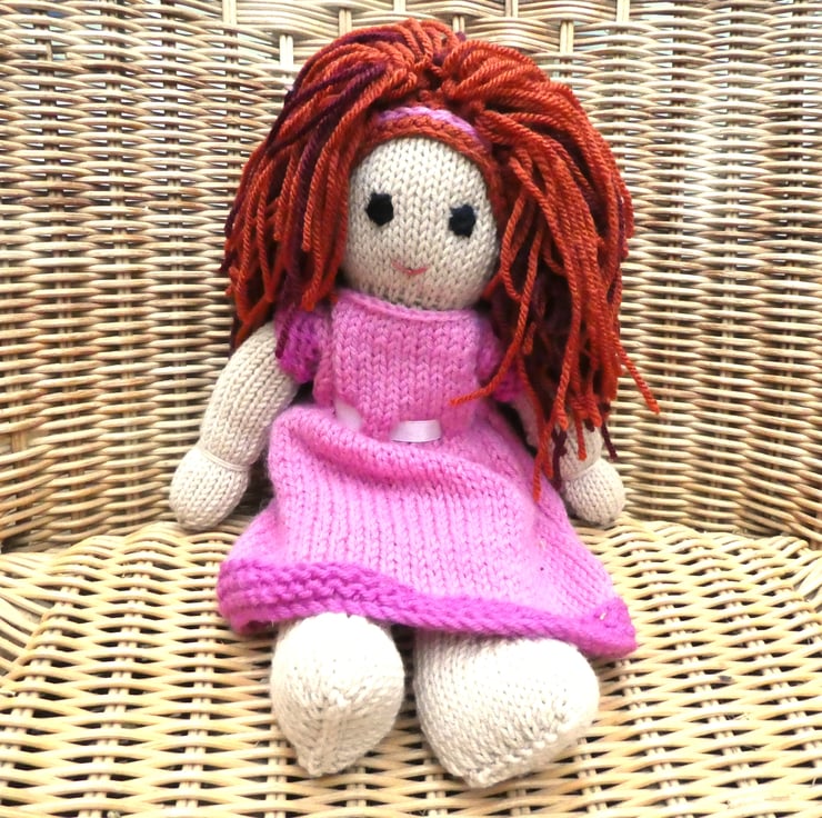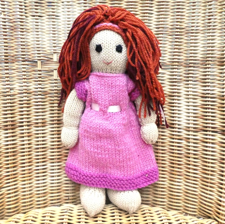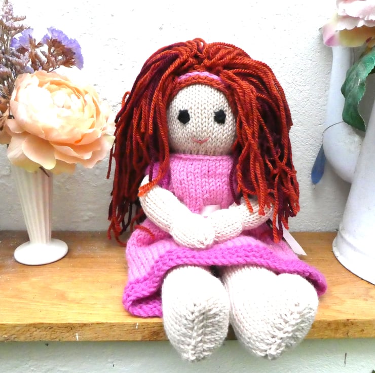 Doll. 12" Hand Knitted Doll Red Hair Doll Handmade in Wool With Removable Dress