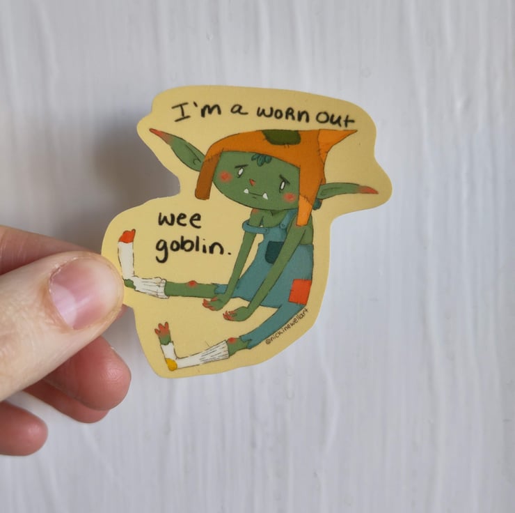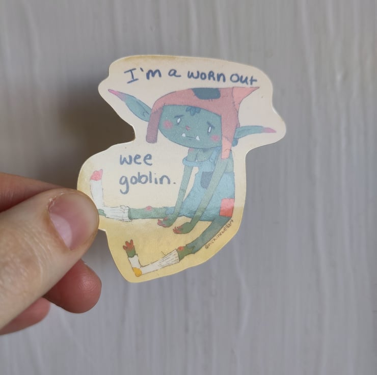 This Worn Out Wee Goblin sticker is perfect for a fantasy or DnD sticker lover and/or collector. This sticker is waterproof vinyl and can hold up on a water bottle run through the dishwasher (for at least a few goes) without peeling or fading.