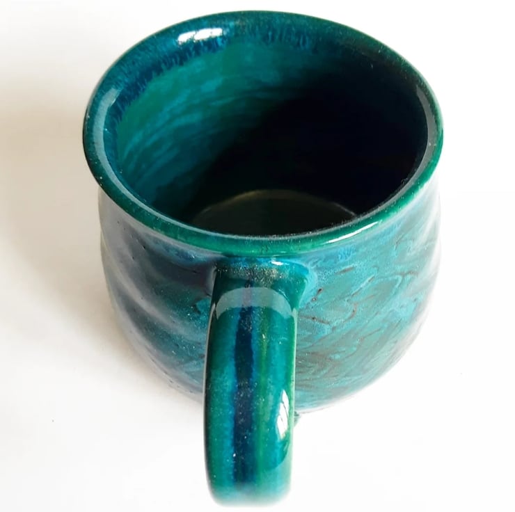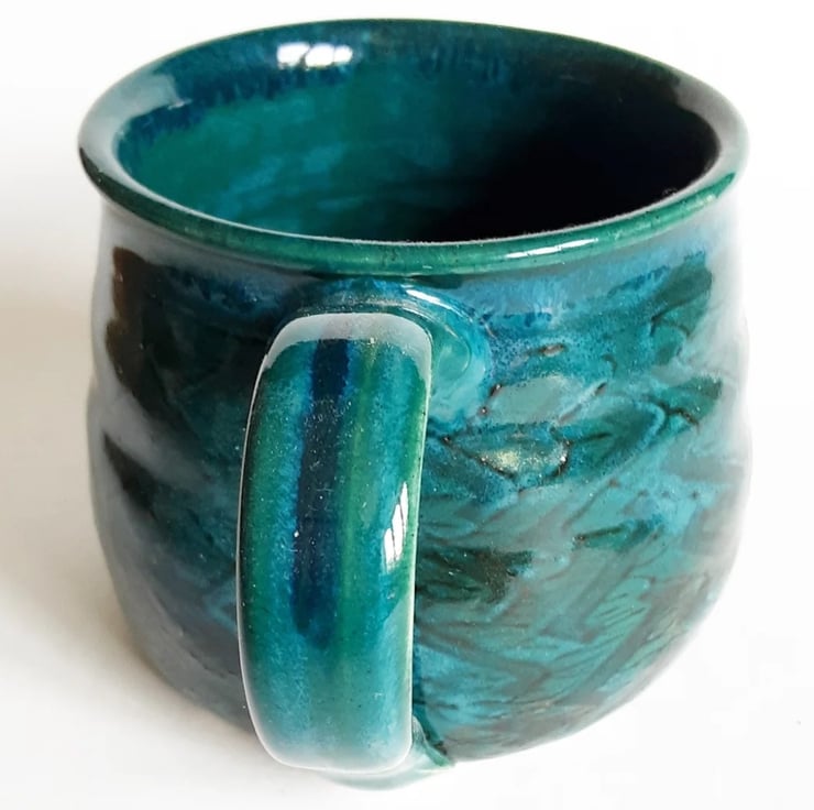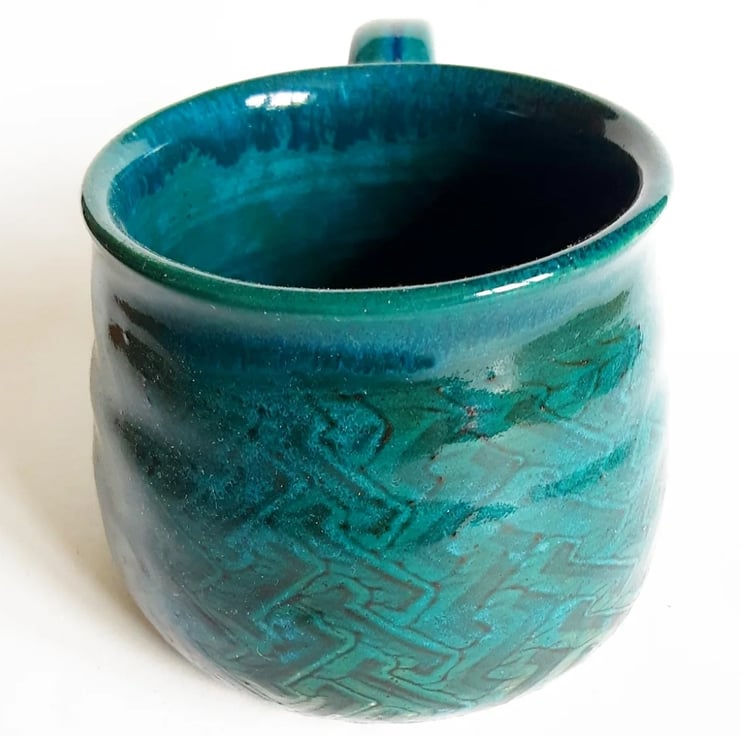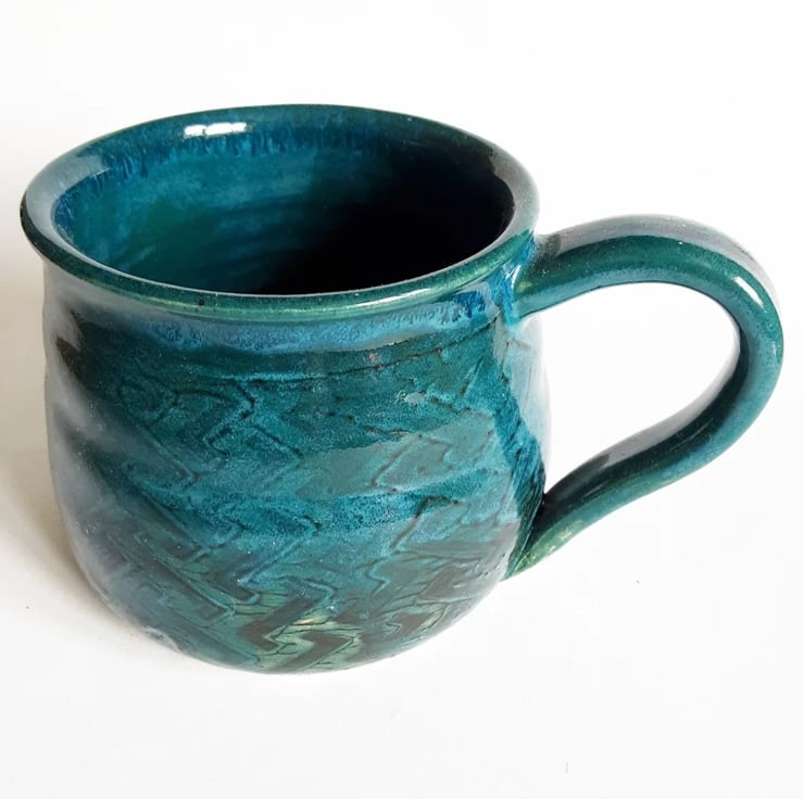 Glazed in dark Turquoise glaze with a pattern on the mug.