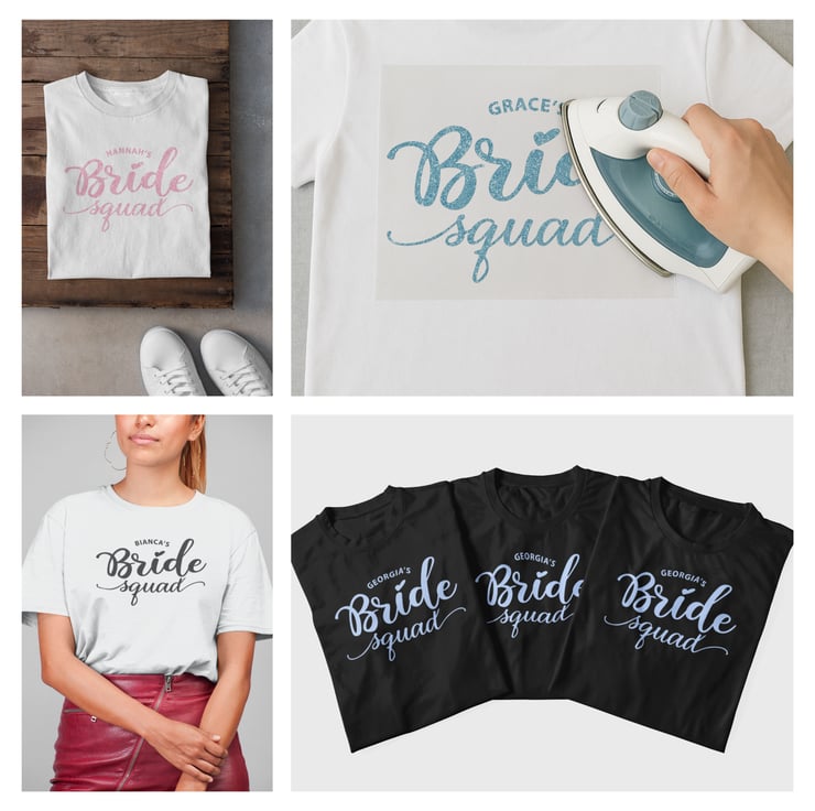 - 1 x personalised iron-on “Bride Squad” HTV transfer with your chosen name and colour