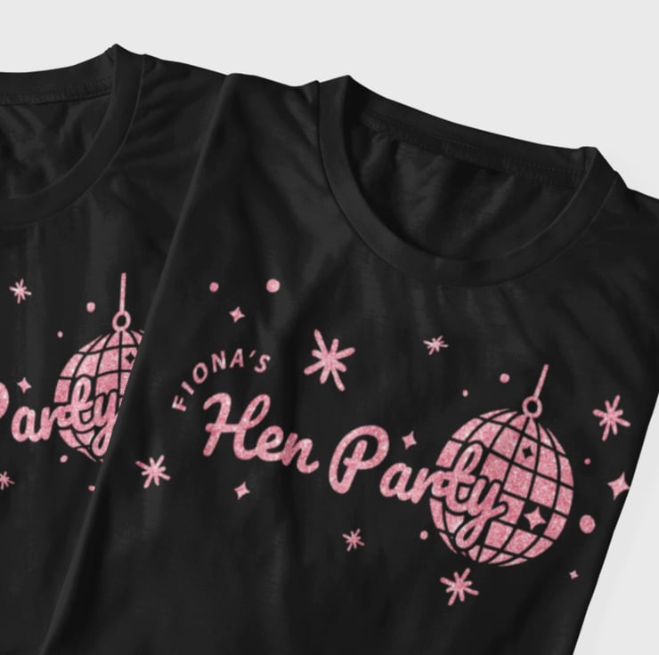 - 1 x personalised iron-on “Hen Party” transfer featuring a disco ball and custom name