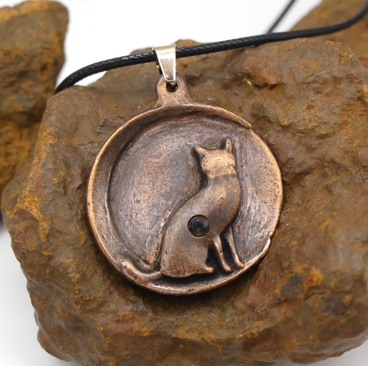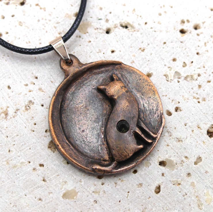 Copper Cat Sitting On A Moon with Citrine Gemstone Pendant Necklace