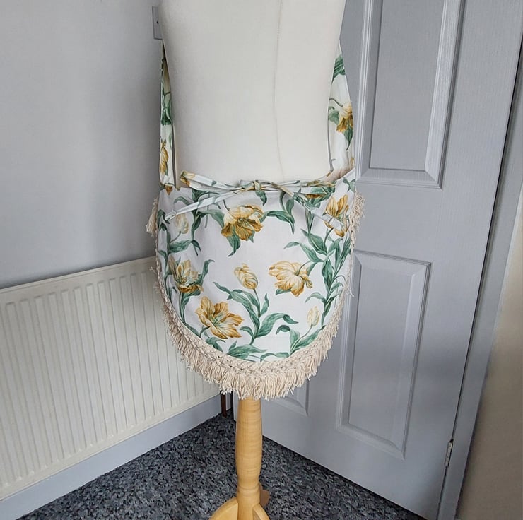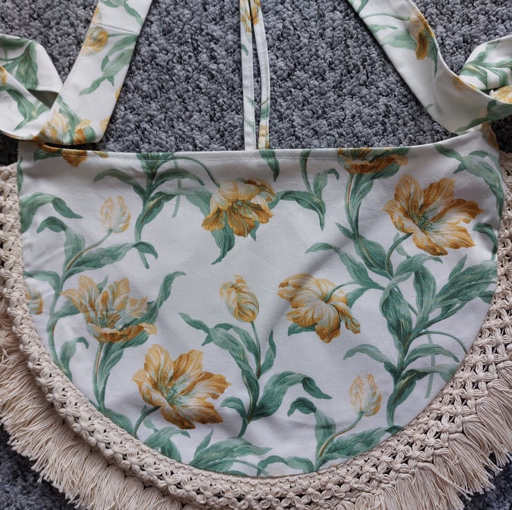 Boho bag handmade using vintage curtain fabric and a cotton 3" crocheted fringe. Sizes are 16 " wide x11" in depth. Strap is approx. 55" in length. Bag is fully lined and has centre ties.