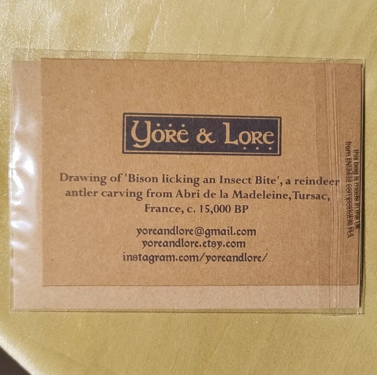Black ink drawing of an artefact known as 'Bison Licking an Insect Bite' from the Upper Palaeolithic rock shelter site, Abri de la Madeleine, in Tursac, Dordogne, France. The artefact is a carving, on on reindeer antler, depicting a bison. It is thought to have been part of a spear-thrower and is dated to c. 15,000 BP.