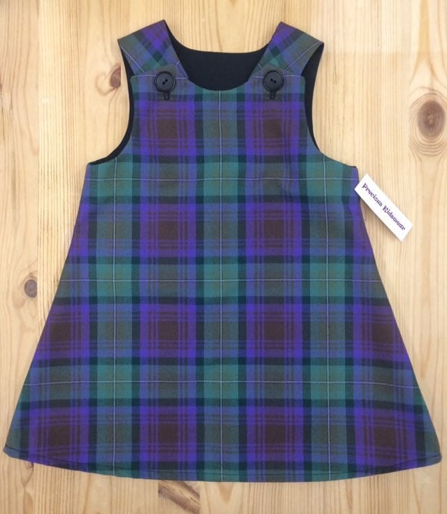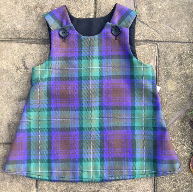 Baby girls pinafore dress with button fastening at each shoulder, made in the Isle of Skye Tartan it is a personal favourite.