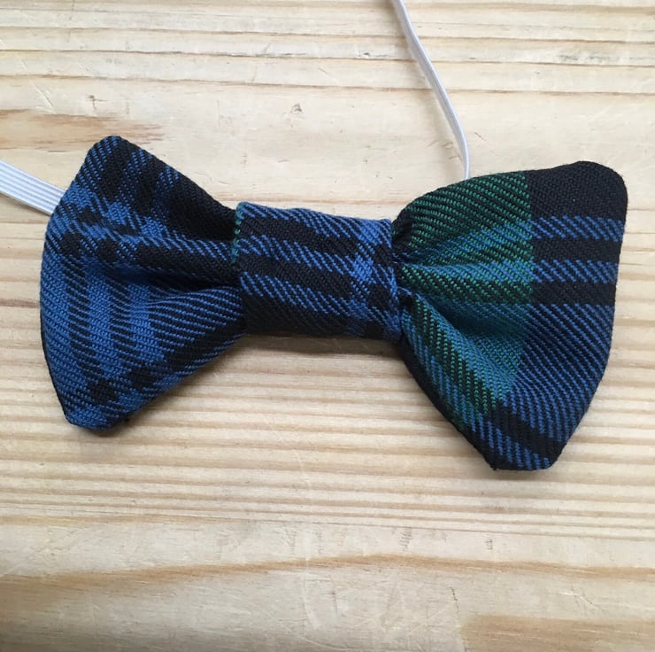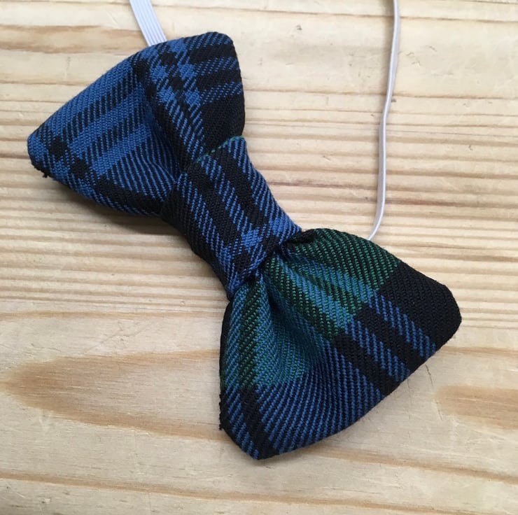 This bow Tie is made from poly viscose tartan, with a cotton black backing and elastic strap.