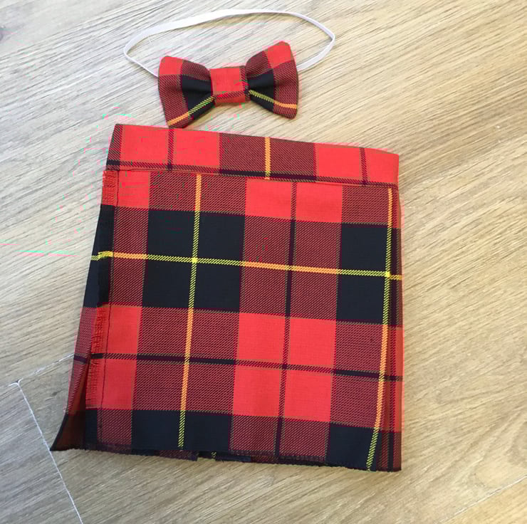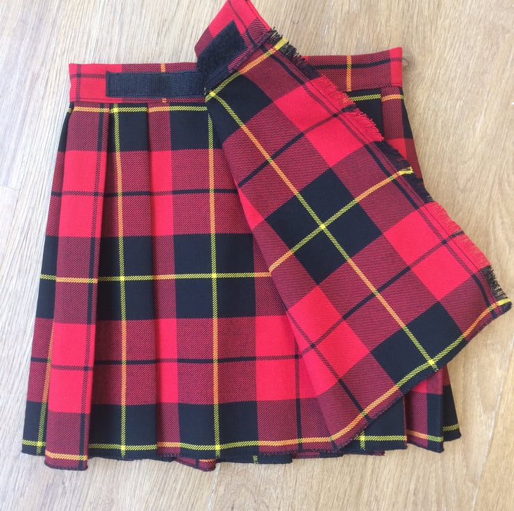 My handmade Wallace tartan kilts are made with comfort in mind, they have a Velcro fastening waist so it can be fitted perfectly and let out slightly after a large meal! The fabric is polyester and viscose making this lighter and more suitable for a baby than traditional heavy wool kilts.