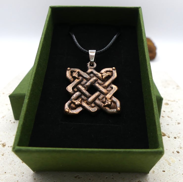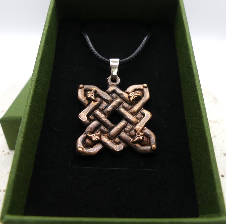 Quaternary knot, also known as a four-cornered Celtic knot has Indications of the four directions: North, South, East, West. The four seasons. The four elements: Earth, Fire, Water, Air. The four Celtic fire festivals: Samhain, Beltane, Imbolc, Lughnasadh. And an emblem of Brigid, also known as the Queen of the Four Fires a she demonstrates her four-branched wisdom of hand, hearth, head and heart. There are also legends that the four-cornered Celtic knot design was created as a symbol of protection.
