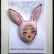 He is made from offcuts of calico and scrim and felt, with a painted calico face. I draw my brooches individually by hand and then stitch them free motion on my trusty sewing machine.