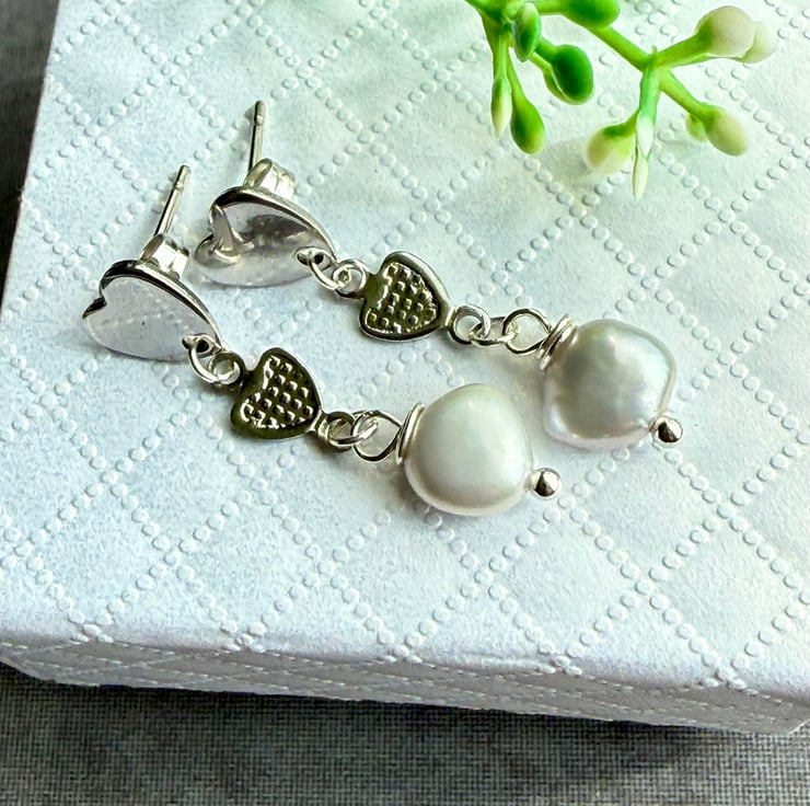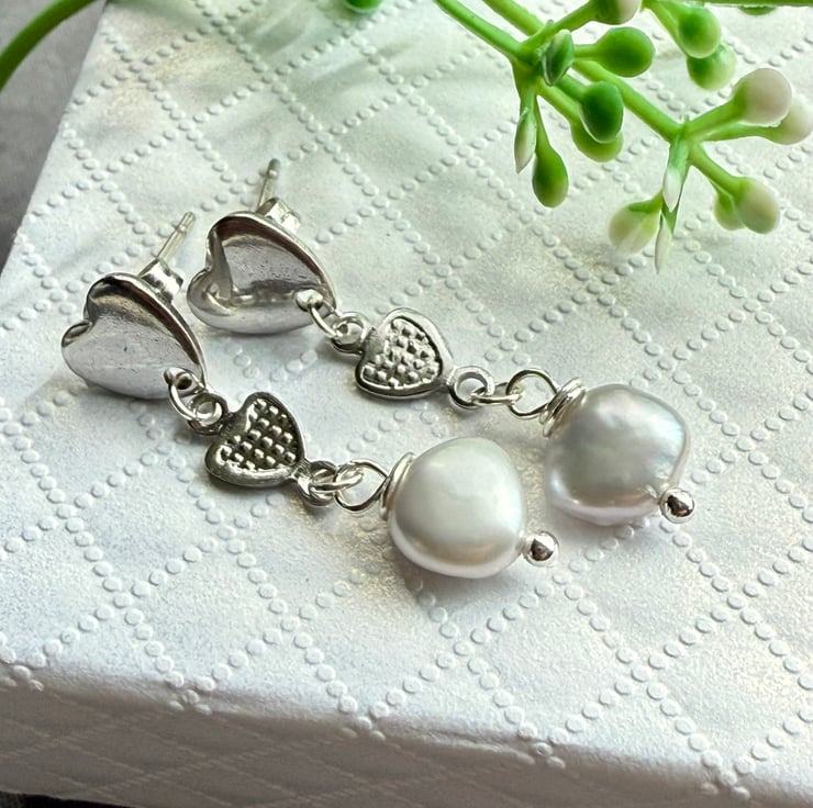Handmade, simple, pretty understated one of a kind earrings. Plain Stainless Steel heart stud with a patterned heart below. To finish I have added a gorgeous hand wrapped freshwater baroque pearl. These would be ideal for many occasions.... wedding, pearl anniversary, or why not treat yourself.