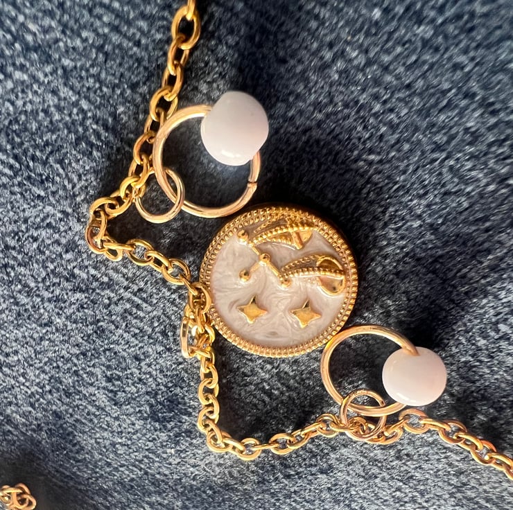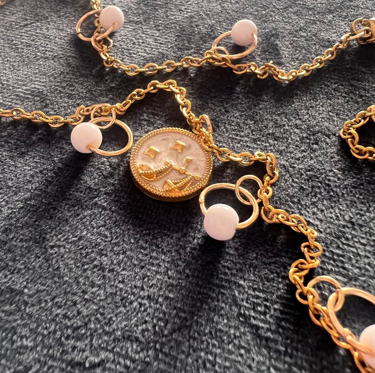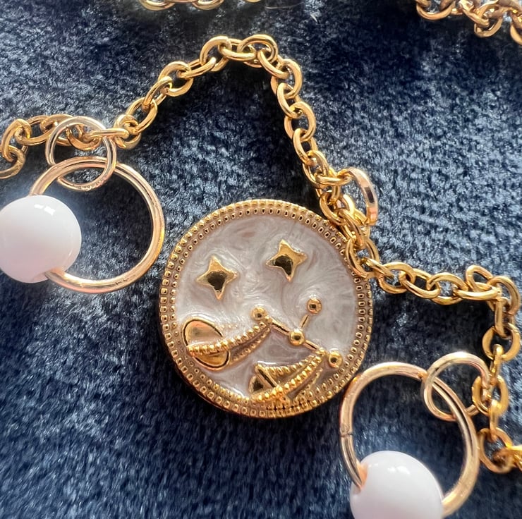 Channel cosmic energy with this gold-toned zodiac pendant, featuring dreamy starry details and elegant charm rings. A perfect gift (or treat to yourself!), you can personalise it with your own zodiac sign for a truly one-of-a-kind piece.