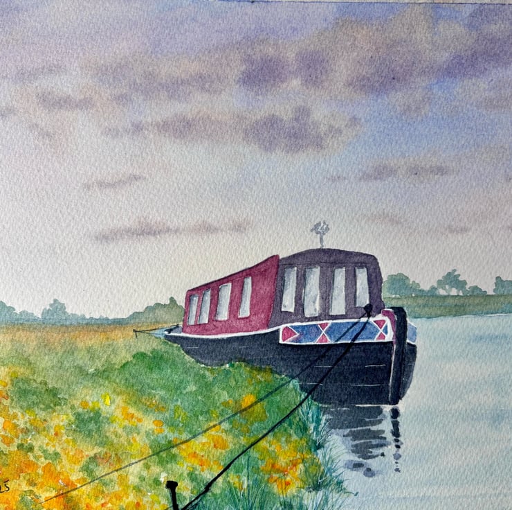 Beautiful original watercolour capturing the tranquility of the morning light as a canal boat sits moored on the bank. This is presented in a 12” x 16” mount