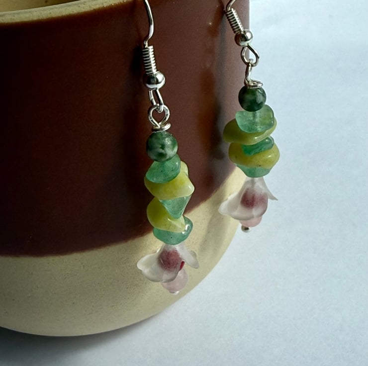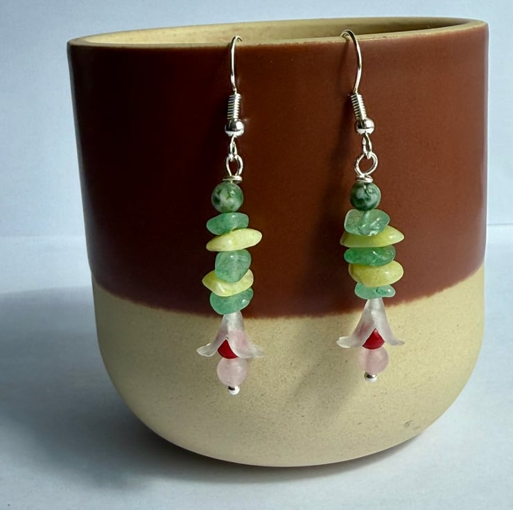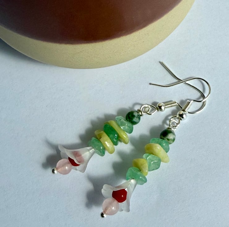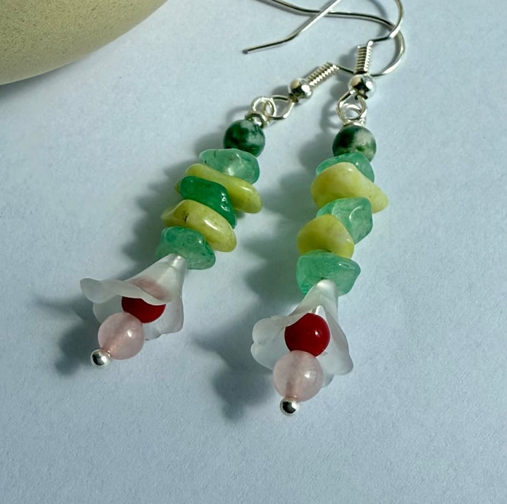 Summer vibes for these handmade one of a kind earrings.Pretty, feminine, and lightweight, ideal for wearing with your summer outfits. For these alternative flower and stem earrings I've used a white acrylic flower adding a stamen of Rose Quartz and red glass beads. The stem is a combination of green Aventurine, Natural lemon Jade and to finish a pretty moss Agate bead. Hung on a Sterling Silver hook ear fitting.