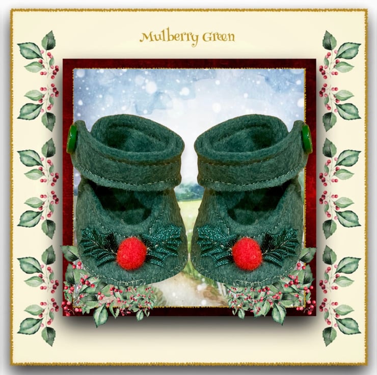 A cute little pair of forest green felt shoes, decorated with holly leaves and berries, to fit the Mulberry Green dolls.