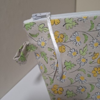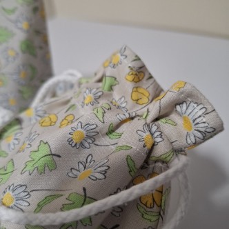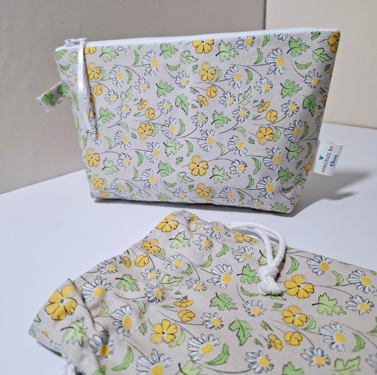 This is a pretty matching set consisting of a cosmetic bag with a drawstring bag which would make a lovely gift for someone or to treat yourself. Handmade using cotton fabric with a cream background, yellow flowers and hints of green and white. Fully lined in ivory polyester. The pouch has a zip closure and the drawstring has a soft white rope.