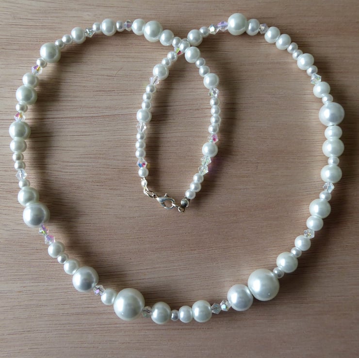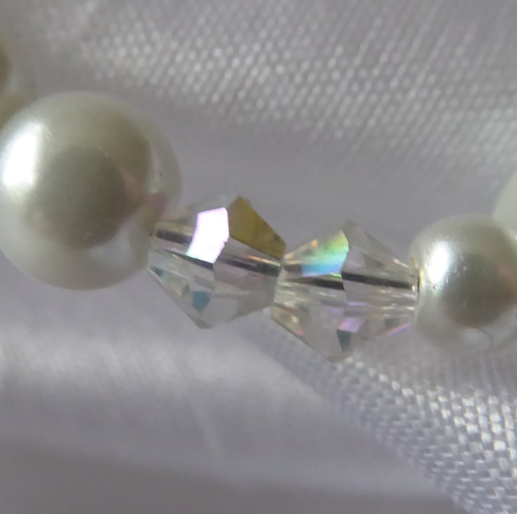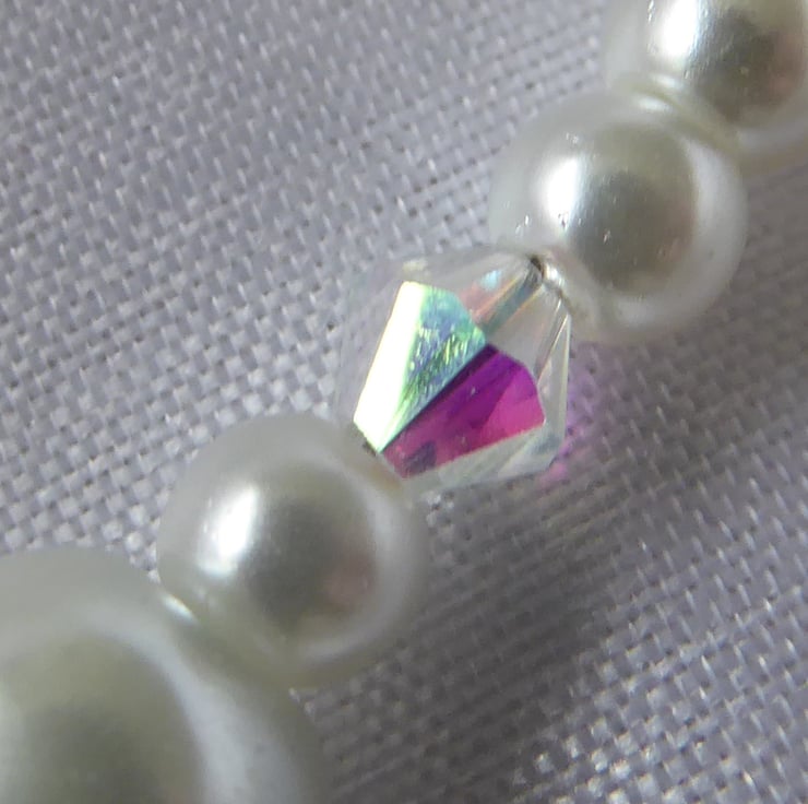 A twist on the classic string of pearls, this beautiful faux pearl necklace is accented with tiny AB coated crystals which reflect light in rainbow-coloured sparkles. Perfect for a winter wedding or a special occasion.